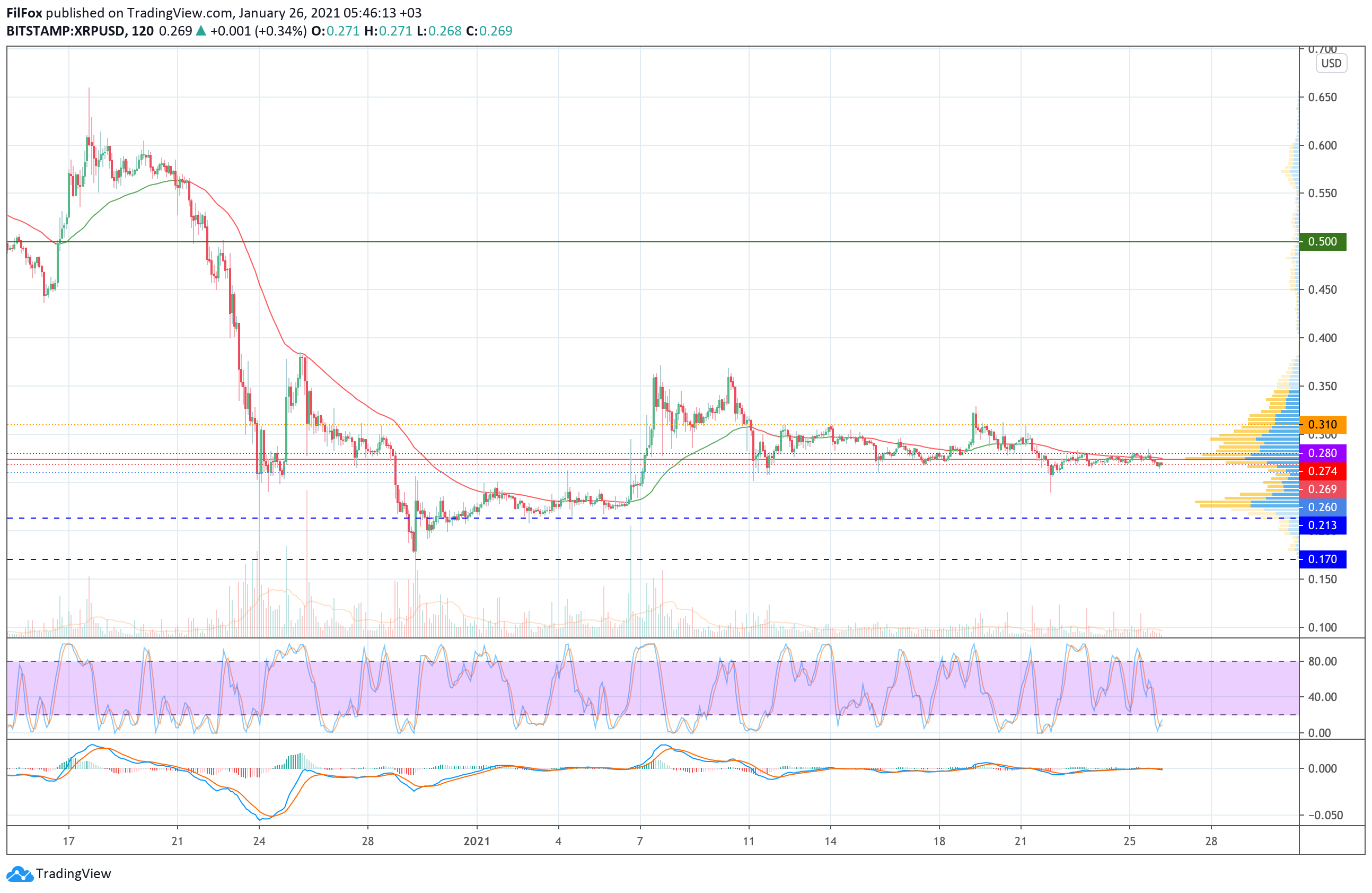 Покупатели вчера безуспешно пытались преодолеть сопротивление нижней границы бокового коридора $0.280 - $0.310. В завершении дня пара откатилась ниже уровня средних цен и сегодня может протестировать поддержку 0.260 USD.