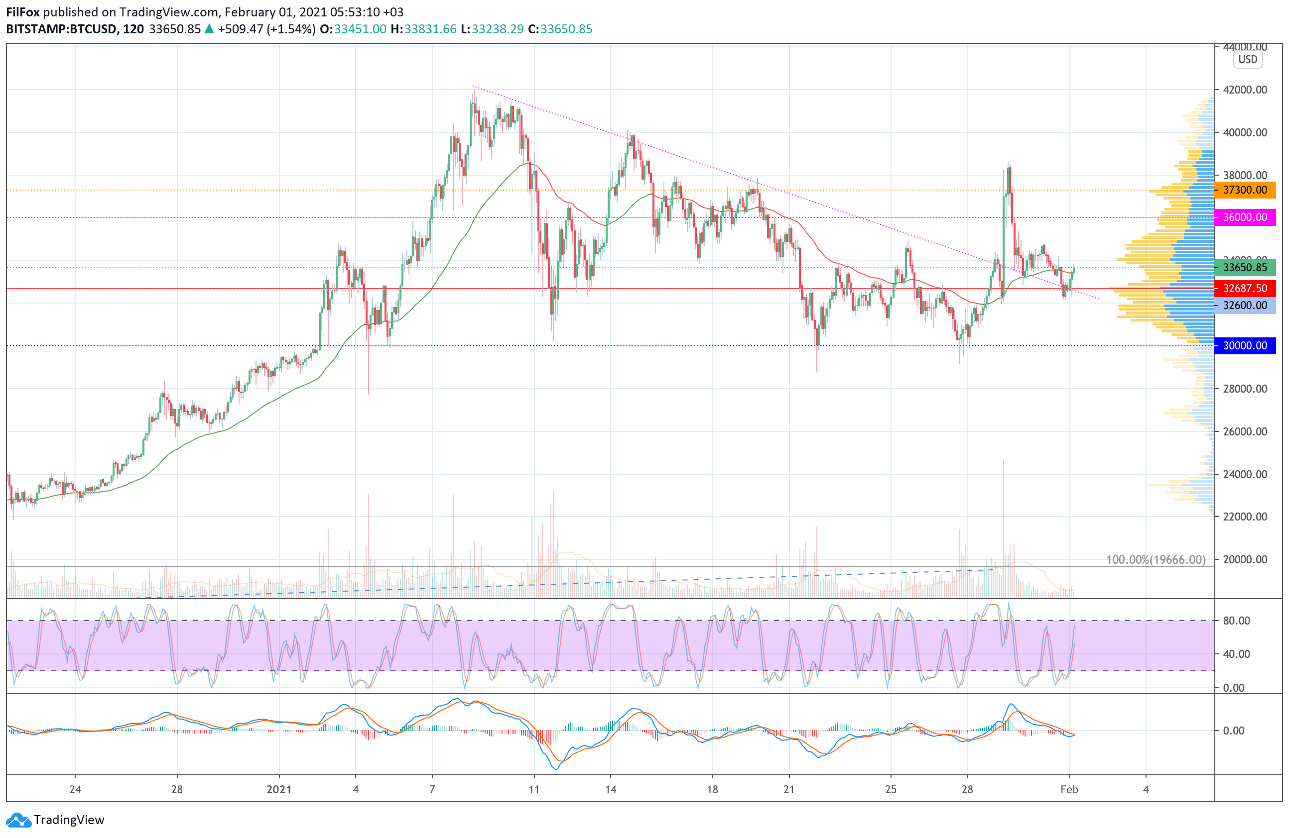Если же объёмы покупок не удастся увеличить, то вскоре пара откатится ниже поддержки на уровне 32600.00 USD, и цена биткоина вернётся в нисходящий канал.