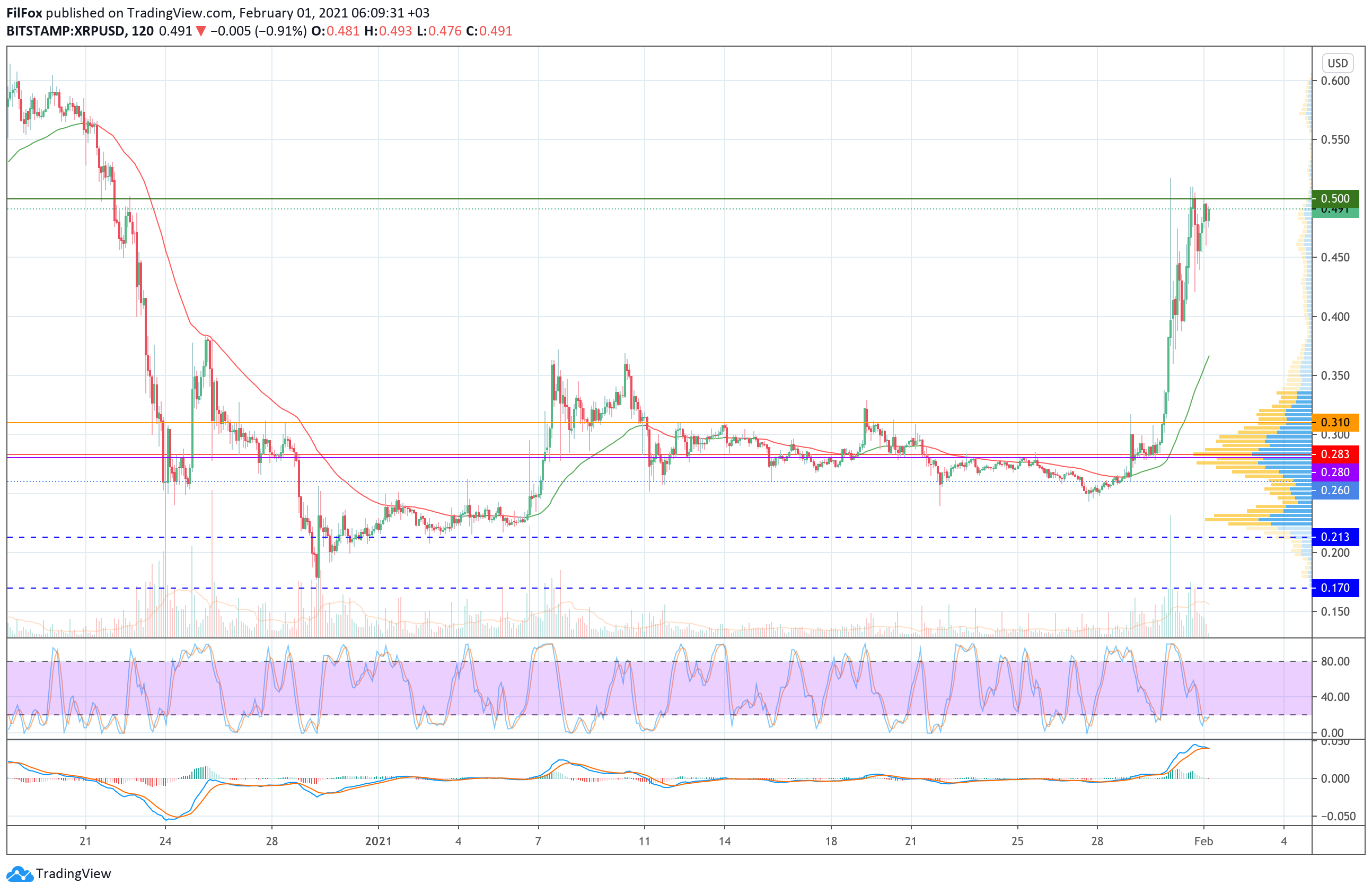 Цена Ripple на выходных пробила сопротивление верхней границы бокового коридора 0.310 USD и покупатели сформировали мощный бычий импульс, который заставил протестировать психологический уровень 0.500 USD.