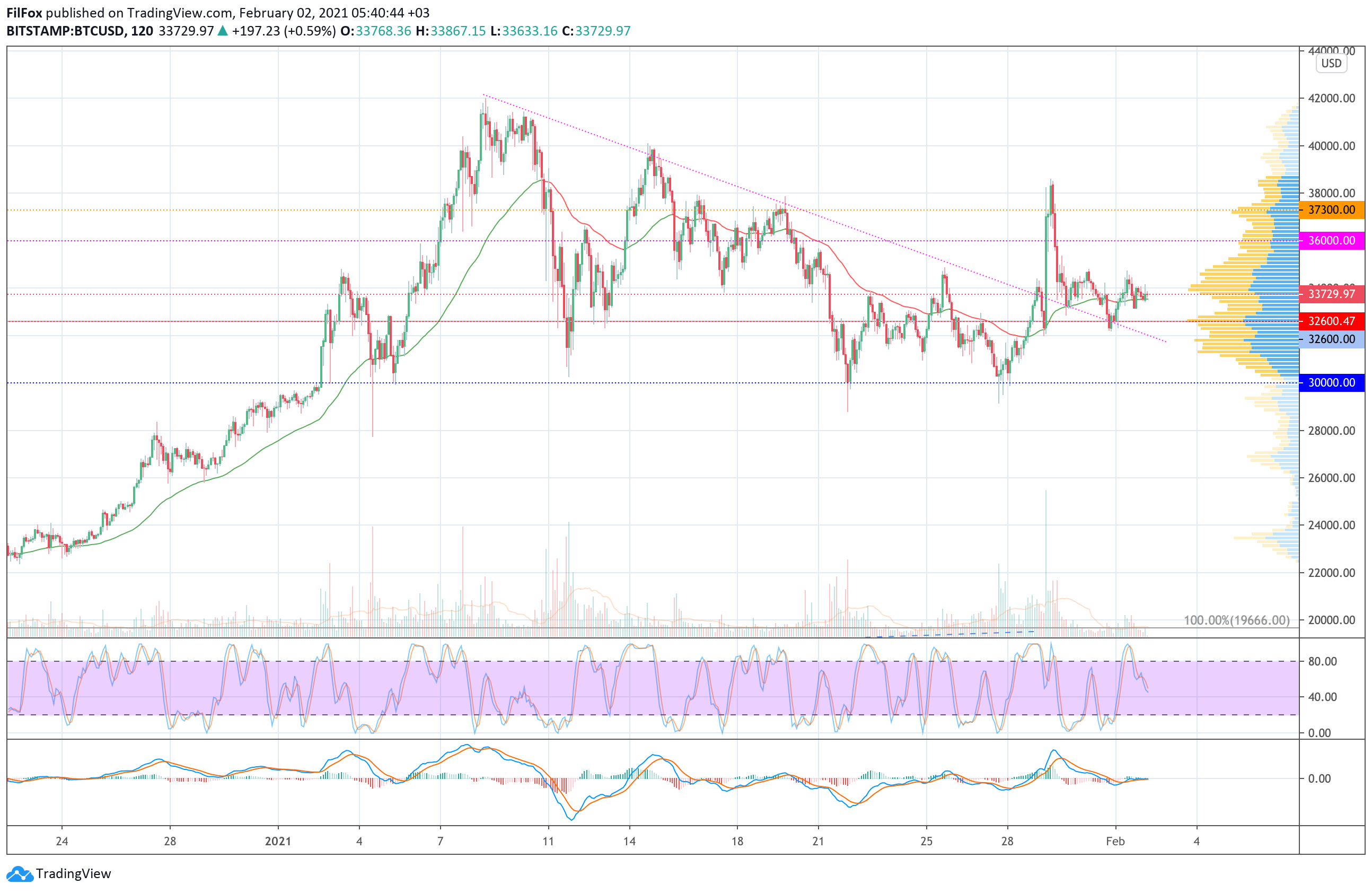 Вчера цена биткоина восстановилась выше сопротивления 34000.00 USD. Во второй половине дня продавцы пытались продавить двухчасовую EMA55, но до конца дня пара смогла удержаться выше уровня средних цен.