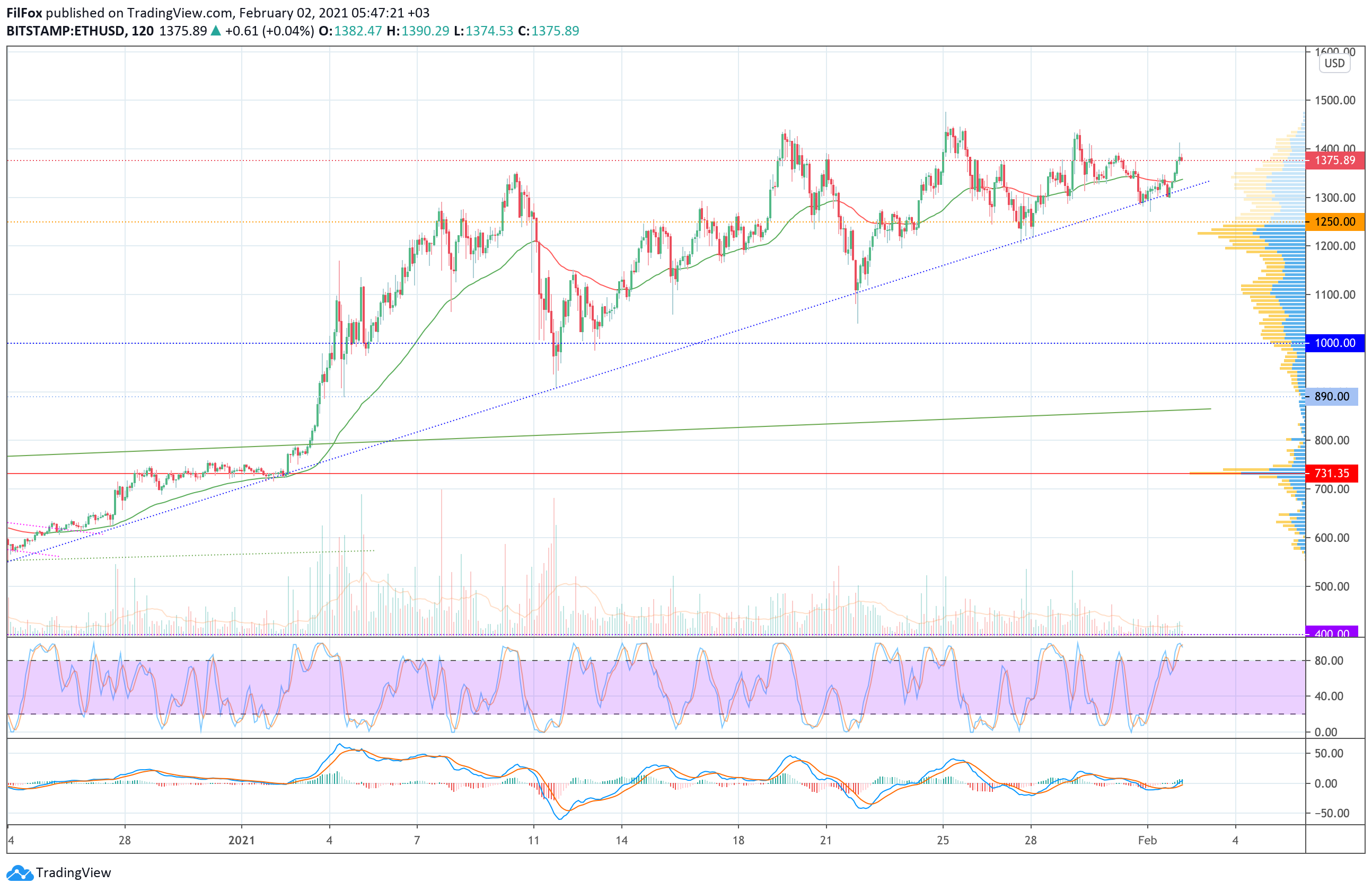 Вчера покупатели смогли продолжить восстановление цены эфира и сегодня ночью пара протестировала отметку 1400.00 USD.