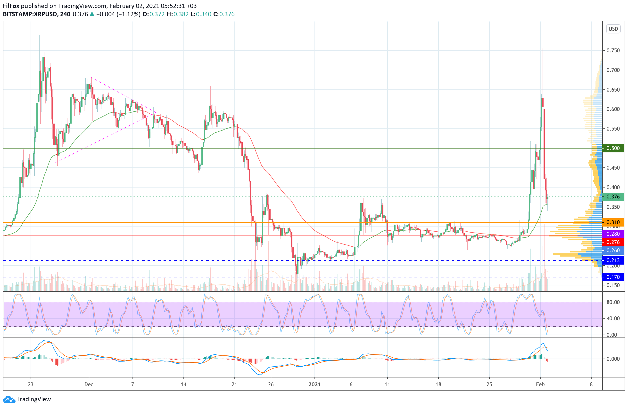 Вчера утром мощный бычий импульс прорвал сопротивление 0.500 USD, а днём цена XRP смогла протестировать отметку 0.755 USD.