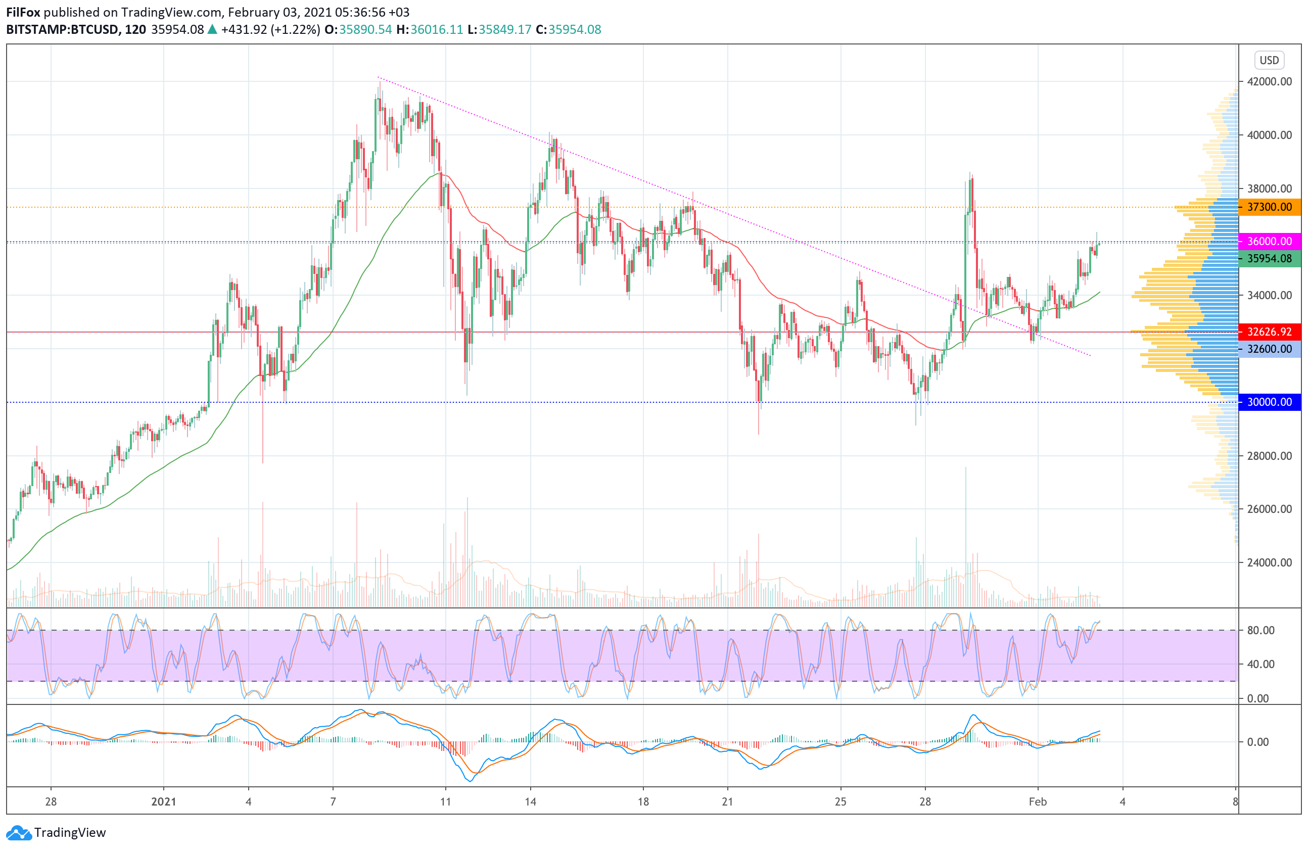 Если объёмы покупок удастся нарастить, то покупатели смогут прорваться к очередному рубежу на отметке 37300.00 USD. Закрепление цены выше уровня 36000.00 USD позволит быкам до конца недели вернуться в зону сопротивления 40000.00 USD.