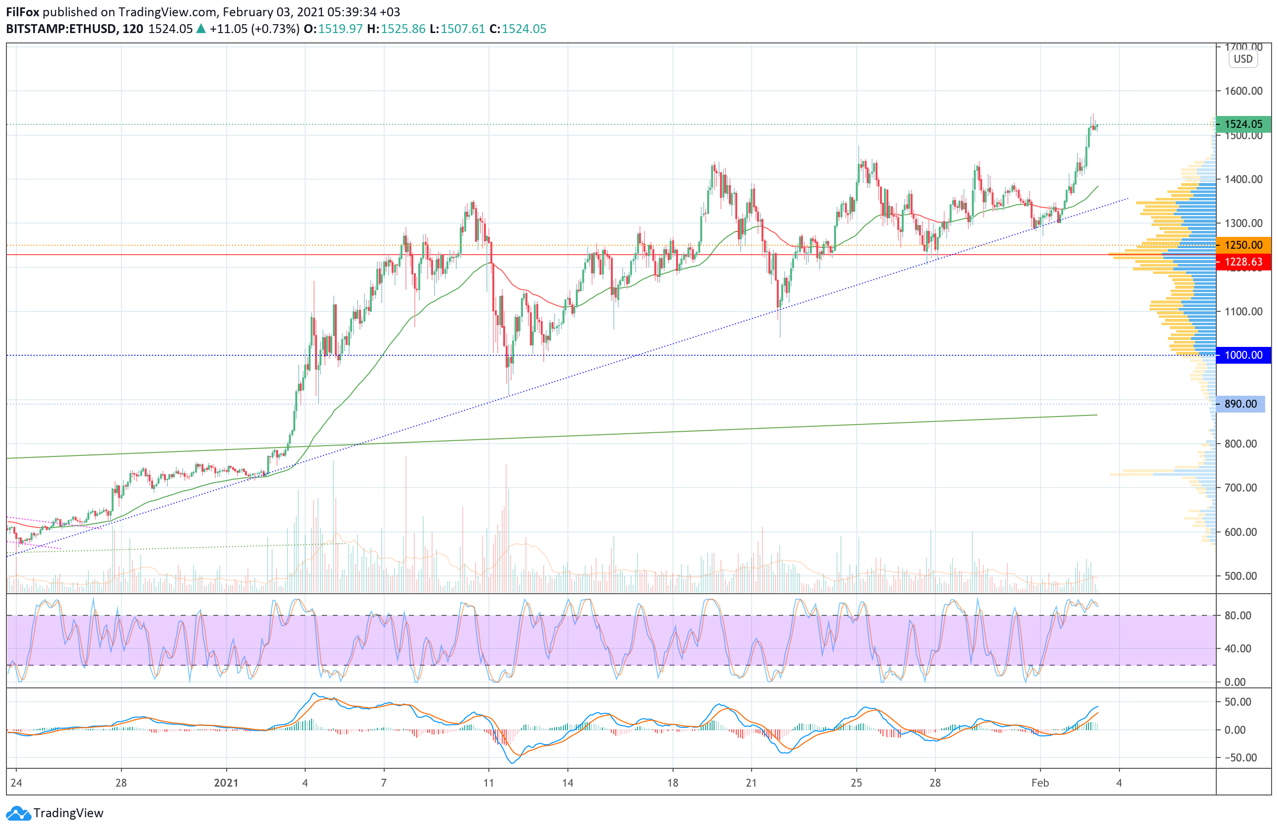 Цена Ethereum достигла абсолютного максимума в районе отметки 1550.00 USD, а цена Bitcoin может вернуться к сопротивлению на уровне 40000.00 USD.