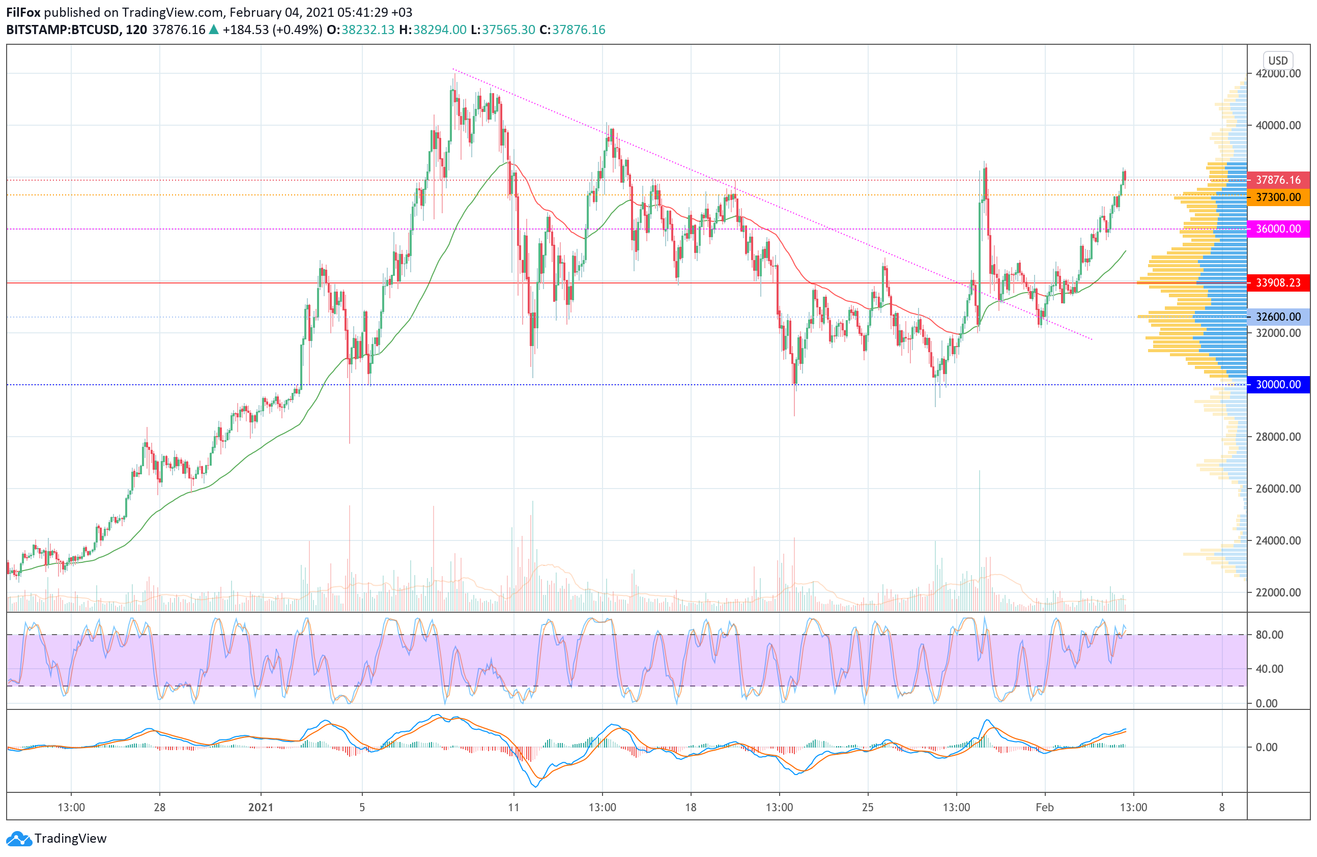 Вчера покупателям удалось прорваться к очередному сопротивлению в районе отметки 37300.00 USD. Сегодня ночью рост продолжился уже на снижающихся объёмах, и цена BTC перевалила рубеж 38000.00 USD, замедляя темпы роста в области 38350.00 USD.