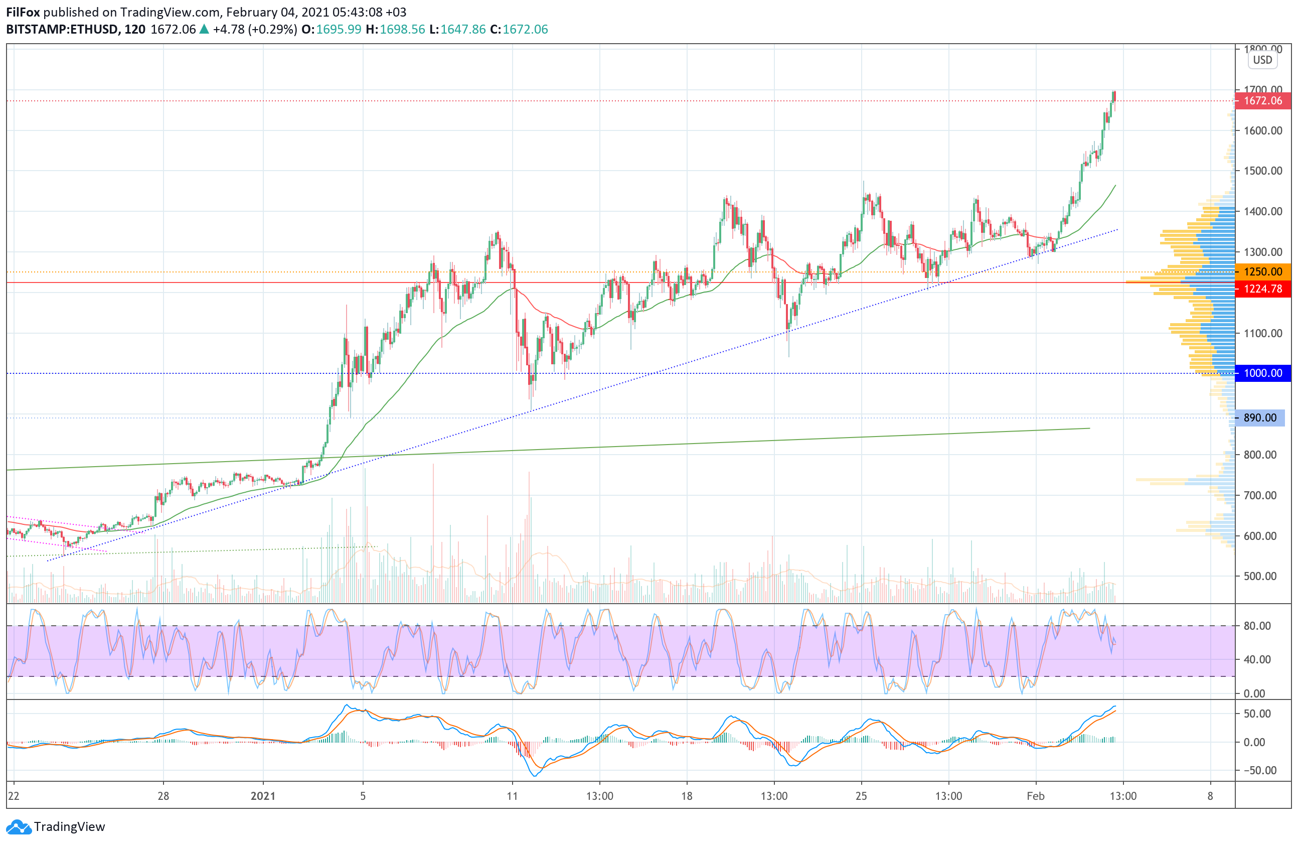 Вчера утром рост цены Ethereum продолжился. Вечером покупатели сформировали мощный бычий импульс и пробили уровень 1600.00 USD, а за минувшую ночь пара вплотную подошла к рубежу 1700.00 USD.