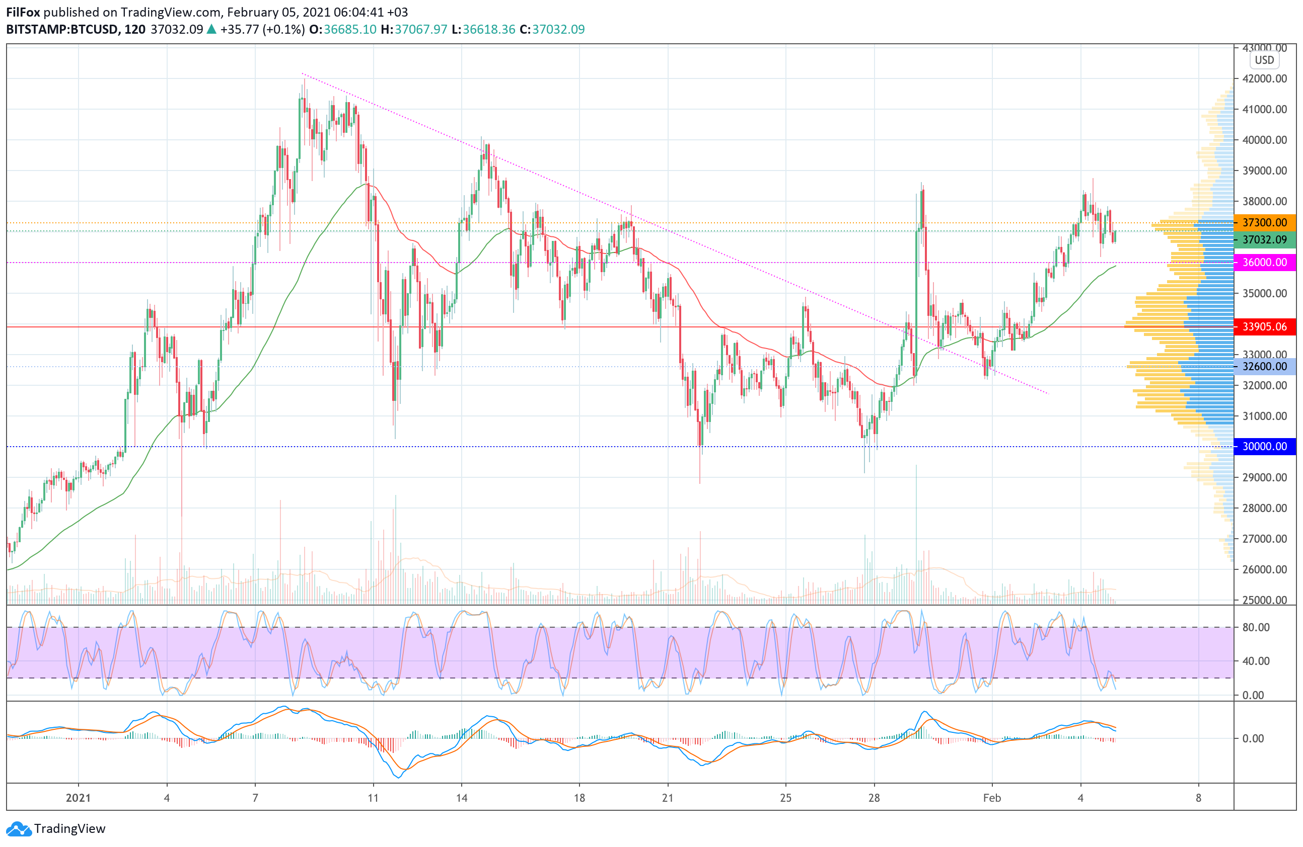 Вчера продавцы перехватили инициативу и в течение дня пытались откатить цену биткоина к поддержке 36000.00 USD. Во второй половине дня пара протестировала уровень 36200.00 USD, объёмы продаж сократились и цена приостановила снижение.
