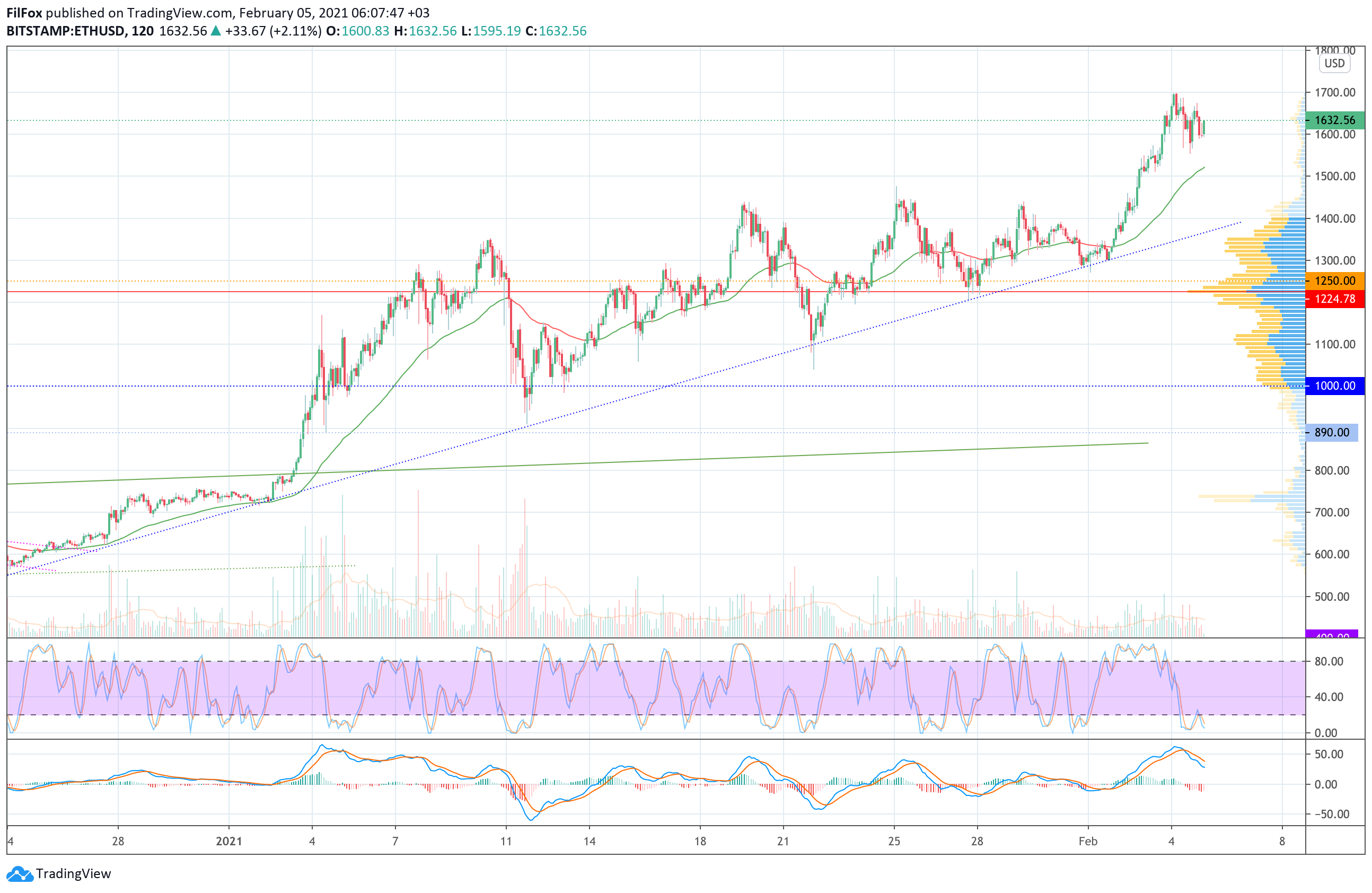 Низкая динамика восстановления позволила цене ETH закрепиться только в районе отметки 1640.00 USD. Если сегодня покупатели смогут нарастить объёмы, то рост может продолжиться и до завершения недели пара обновит абсолютный максимум в области 1740.00 USD.