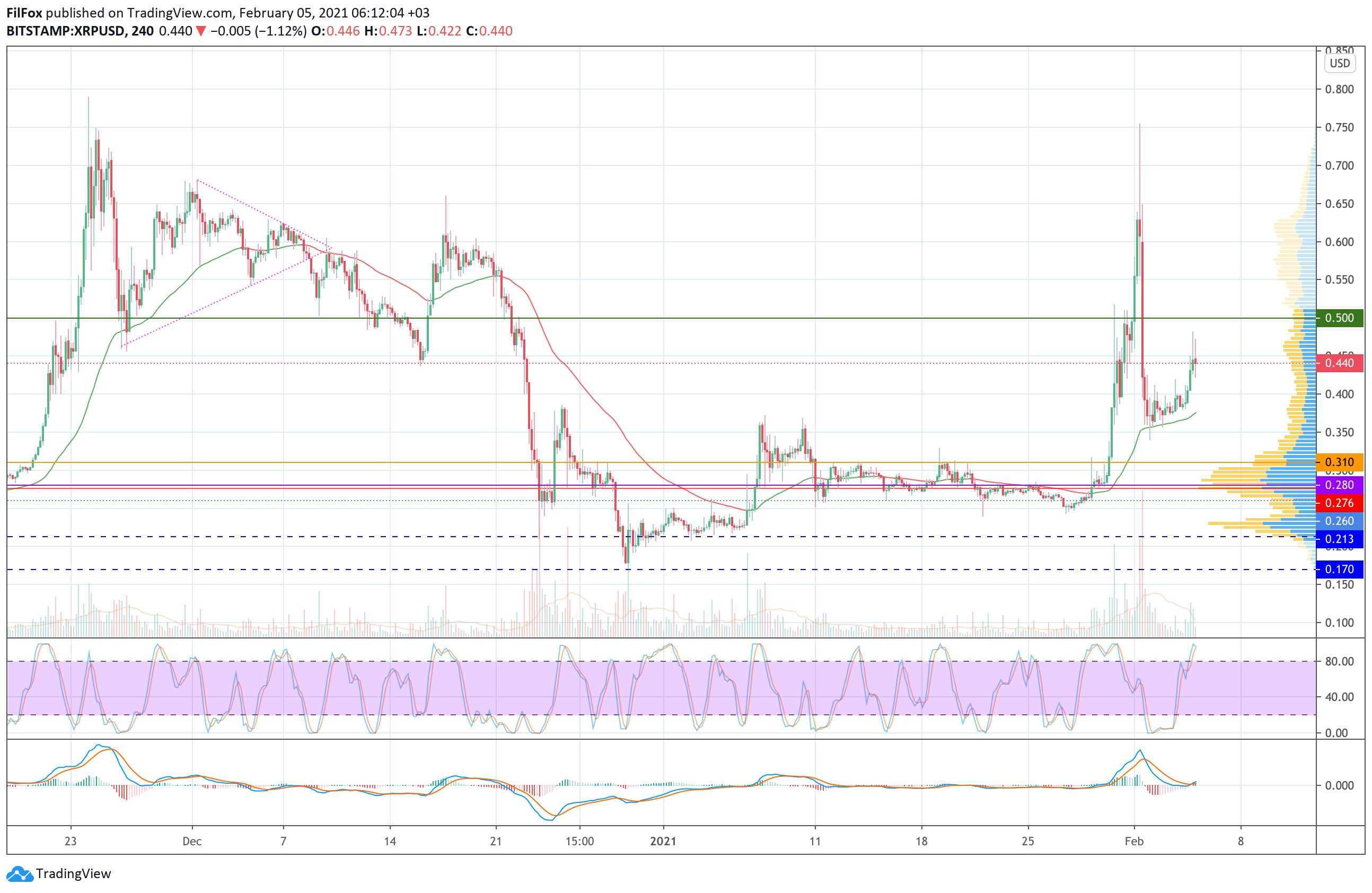 Вчера цена Ripple смогла преодолеть сопротивление 0.400 USD и в итоге обозначила локальный максимум в точке 0.482 USD.