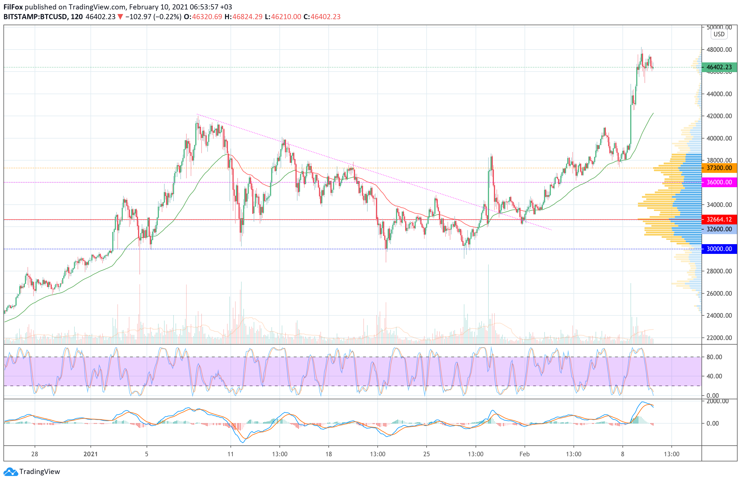 Вчера быки смогли продолжить забег и протестировали уровень 48000.00 USD. Новый максимум зафиксирован в точке 48216.00 USD.