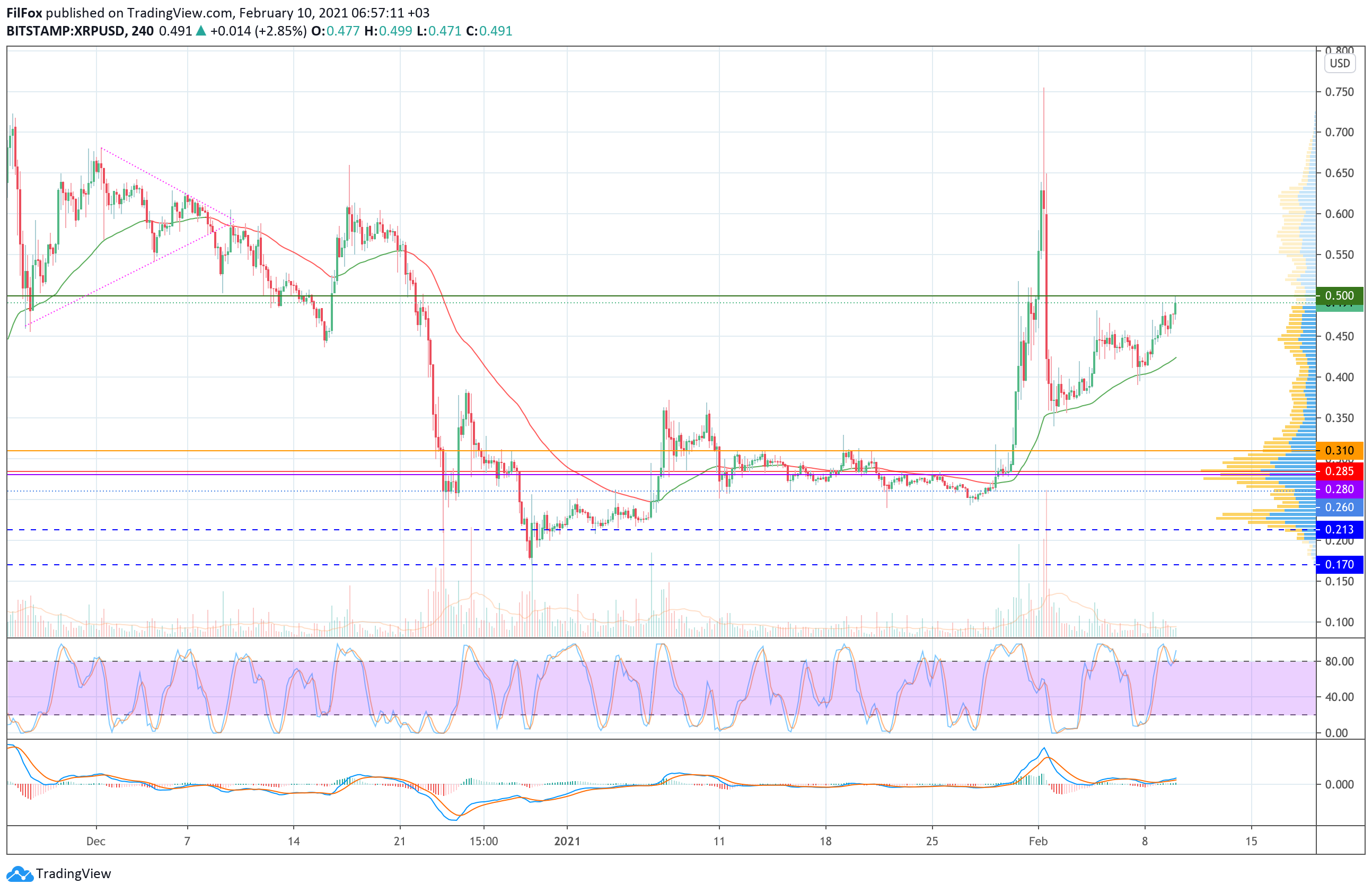 Вчера покупатели попытались оживить торги и вытащили цену XRP из вязкого бокового диапазона, верхняя граница которого (0.450 USD) достаточно продолжительное время удерживала пару от восстановления к психологической отметке 0.500 USD.