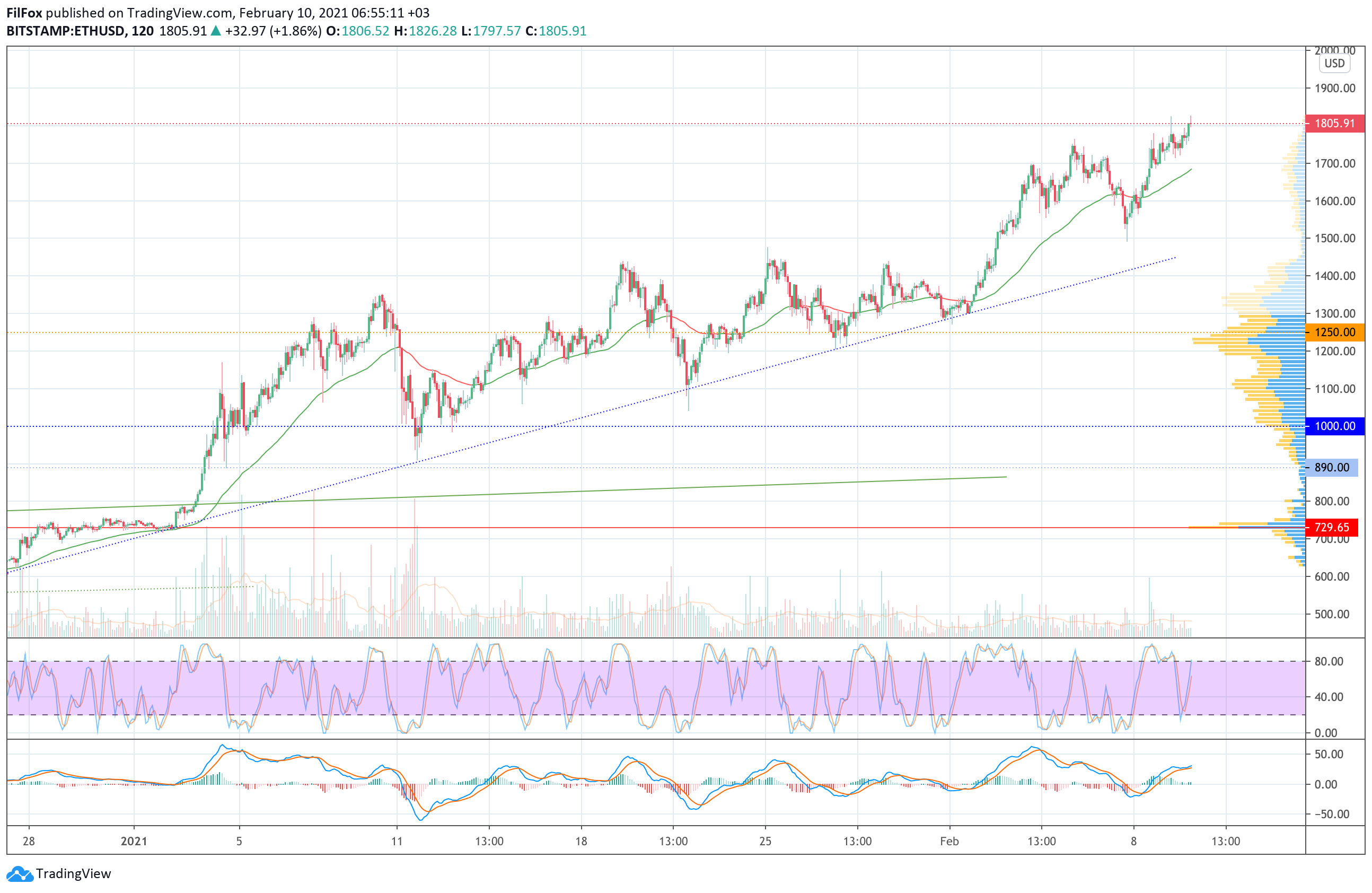 Вчера в первой половине дня цена Ethereum смогла преодолеть уровень 1800.00 USD и обновить абсолютный максимум в точке 1825.00 USD. После небольшого отката, рост возобновился, но проходил на объёмах ниже среднего уровня.