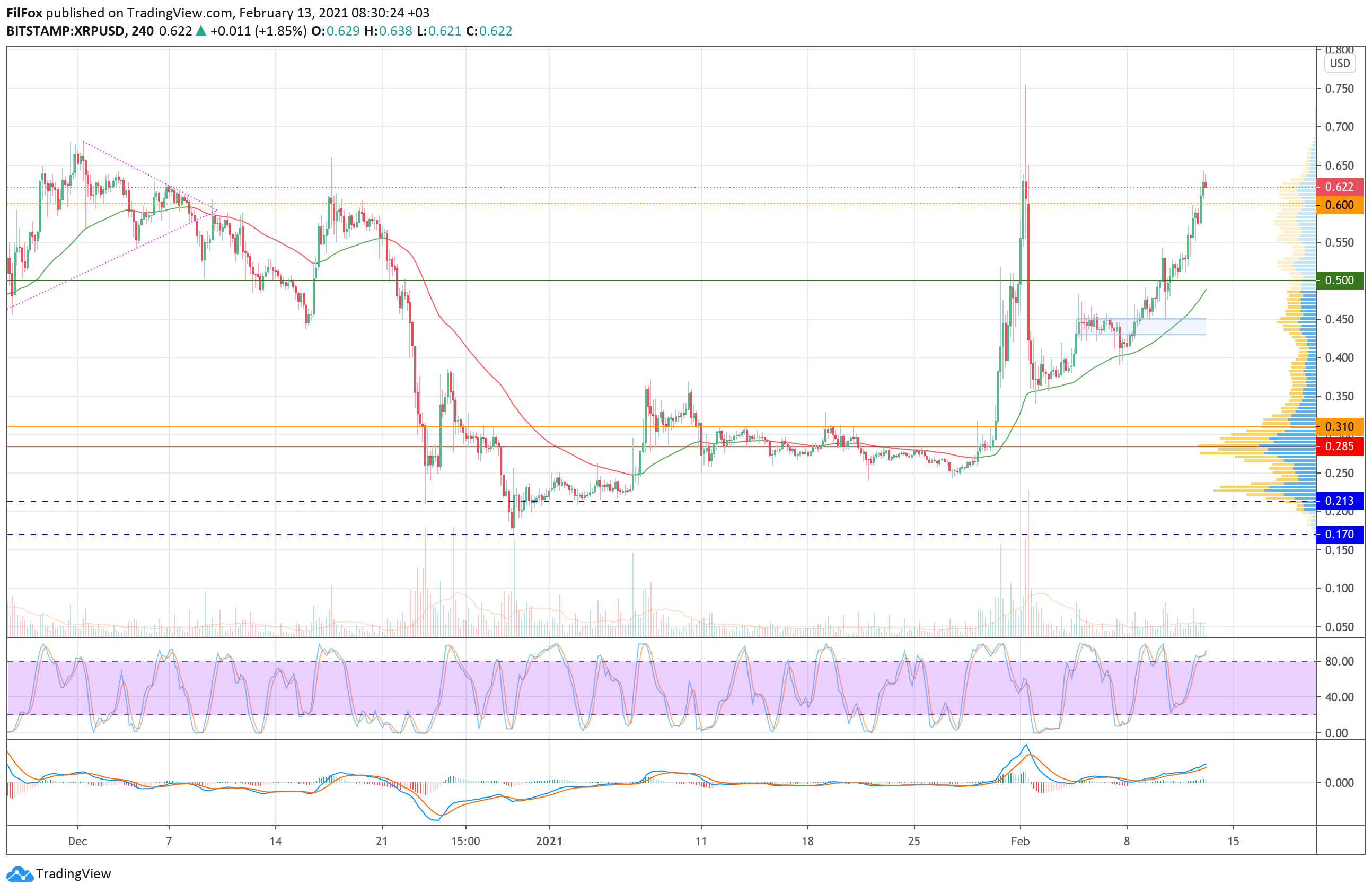 Вчера объёмы покупок уверенно держались на среднем уровне, в результате цена XRP смогла протестировать сопротивление 0.600 USD.