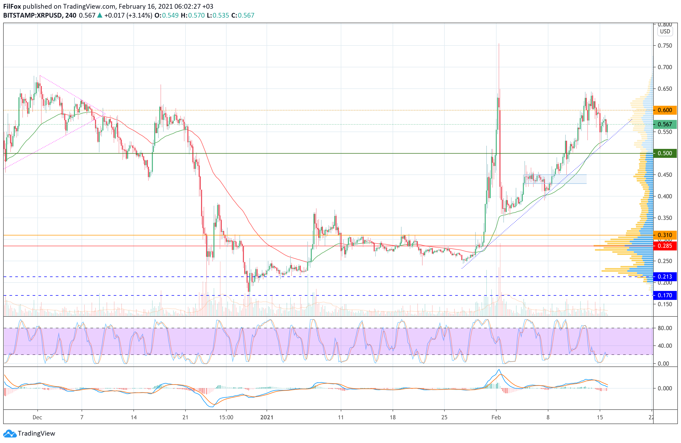 Вчера утром медведи протестировали восходящую трендовую линию, которая удержала цену XRP от снижения к психологической отметке 0.500 USD.