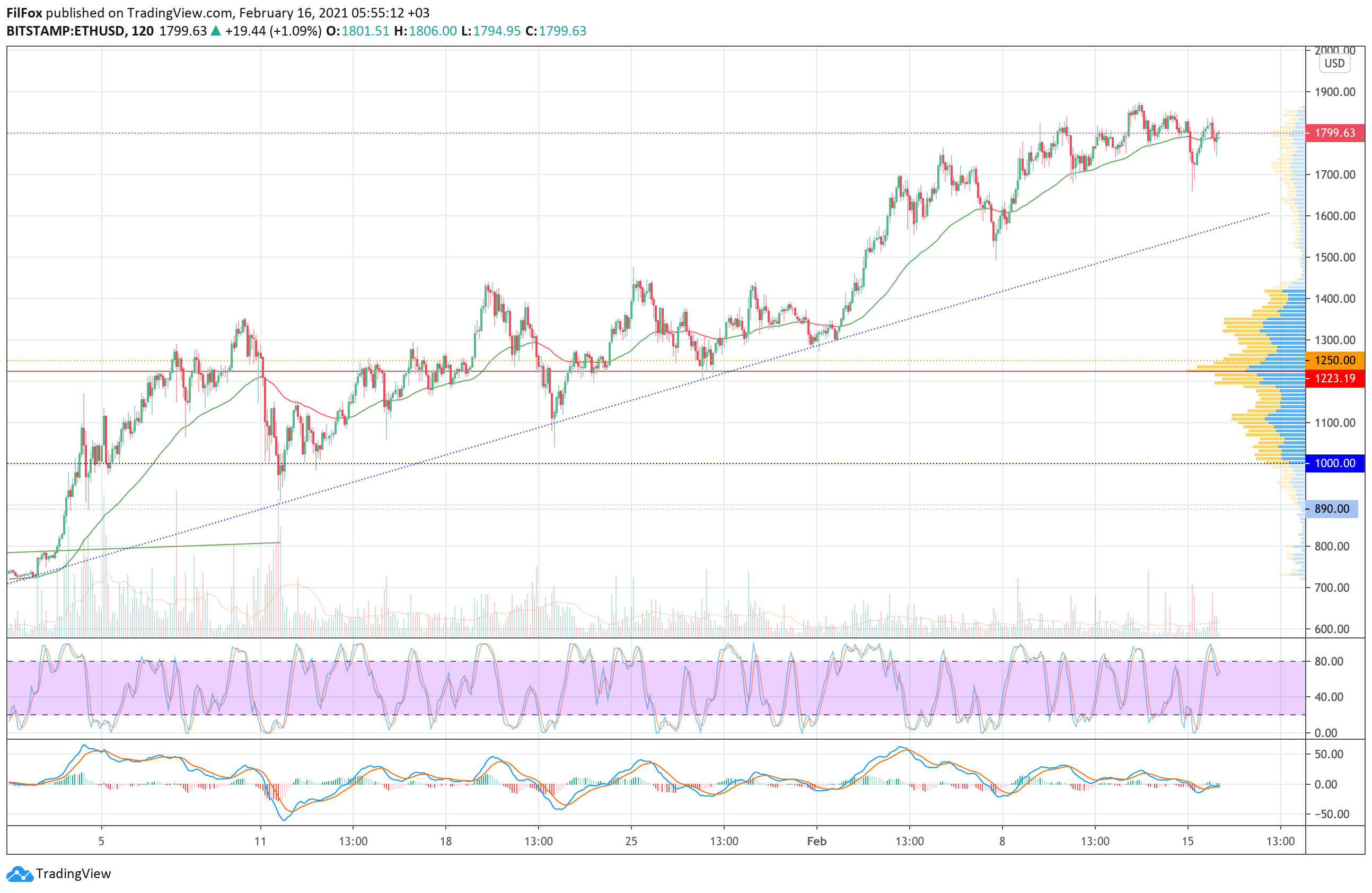 Вчера поддержка на уровне 1700.00 USD ограничила снижение цены Ethereum к синей линии тренда. В течение дня пара восстановилась выше двухчасовой EMA55, замедлив темпы роста в районе отметки 1820.00 USD.