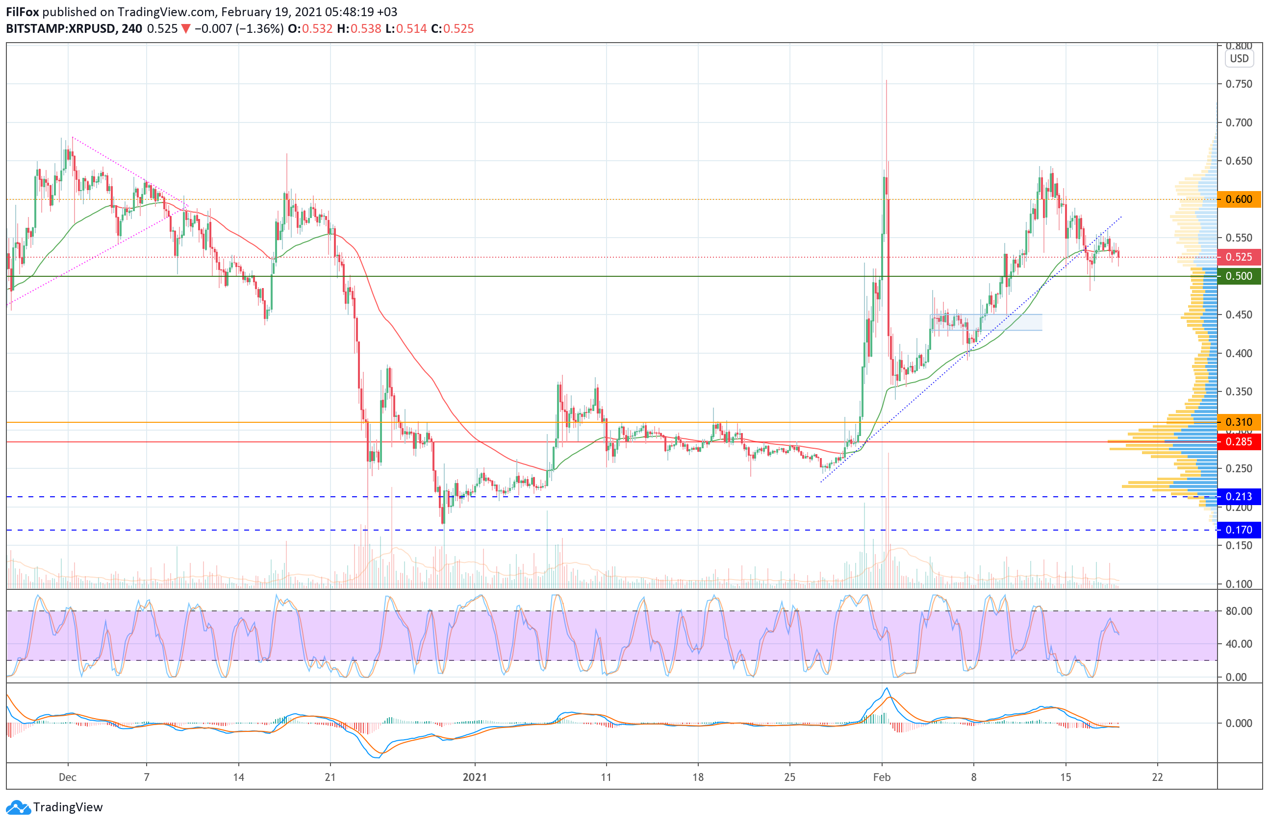 Медведи пытаются прорвать эту скользящую среднюю, но объёмы продаж пока слишком маленькие. Если в течение дня давление продавцов усилится, то медведи откатят цену XRP ниже психологической отметки 0.500 USD.