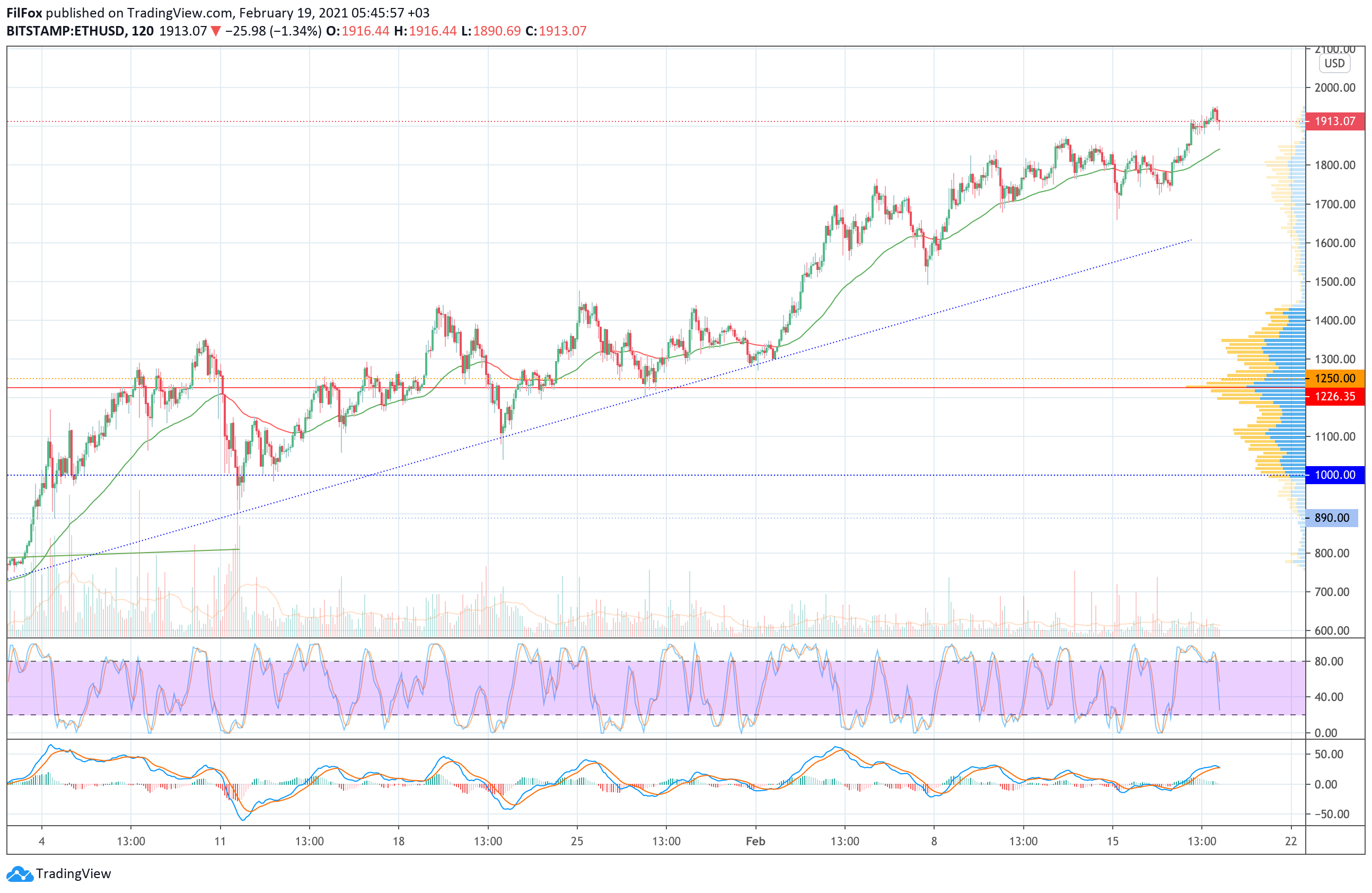 Цена Ethereum вчера не прекращала попытки закрепиться выше уровня 1900.00 USD. В завершении дня покупатели пробили сопротивление 1920.00 USD и сегодня ночью обновили абсолютный максимум в районе отметки 1950.00 USD.