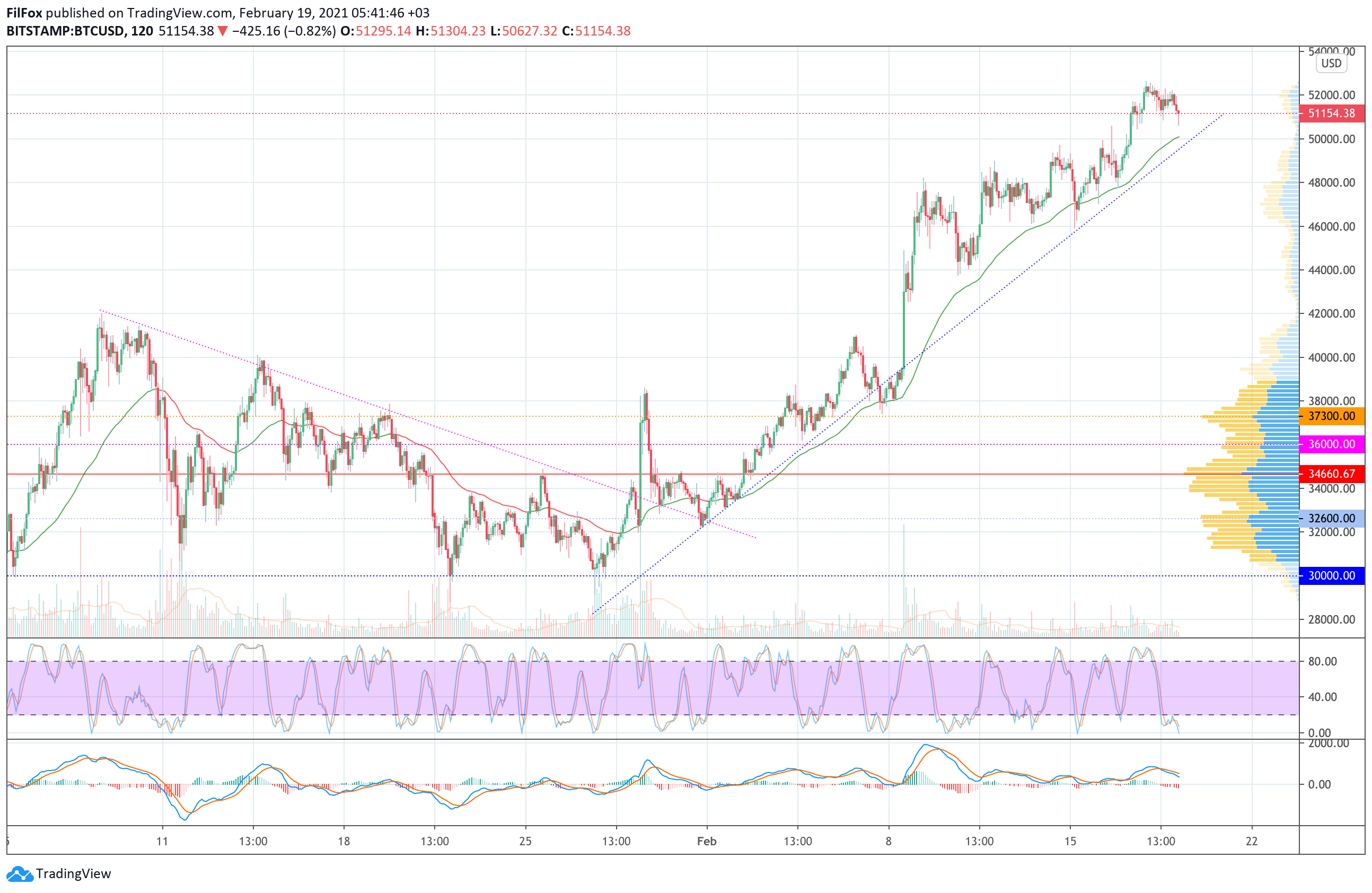 Вчера утром быки не смогли продолжить забег к новому максимуму. Продавцы на мелких объёмах продавили поддержку 52000.00 USD и протестировали уровень 51000.00 USD.