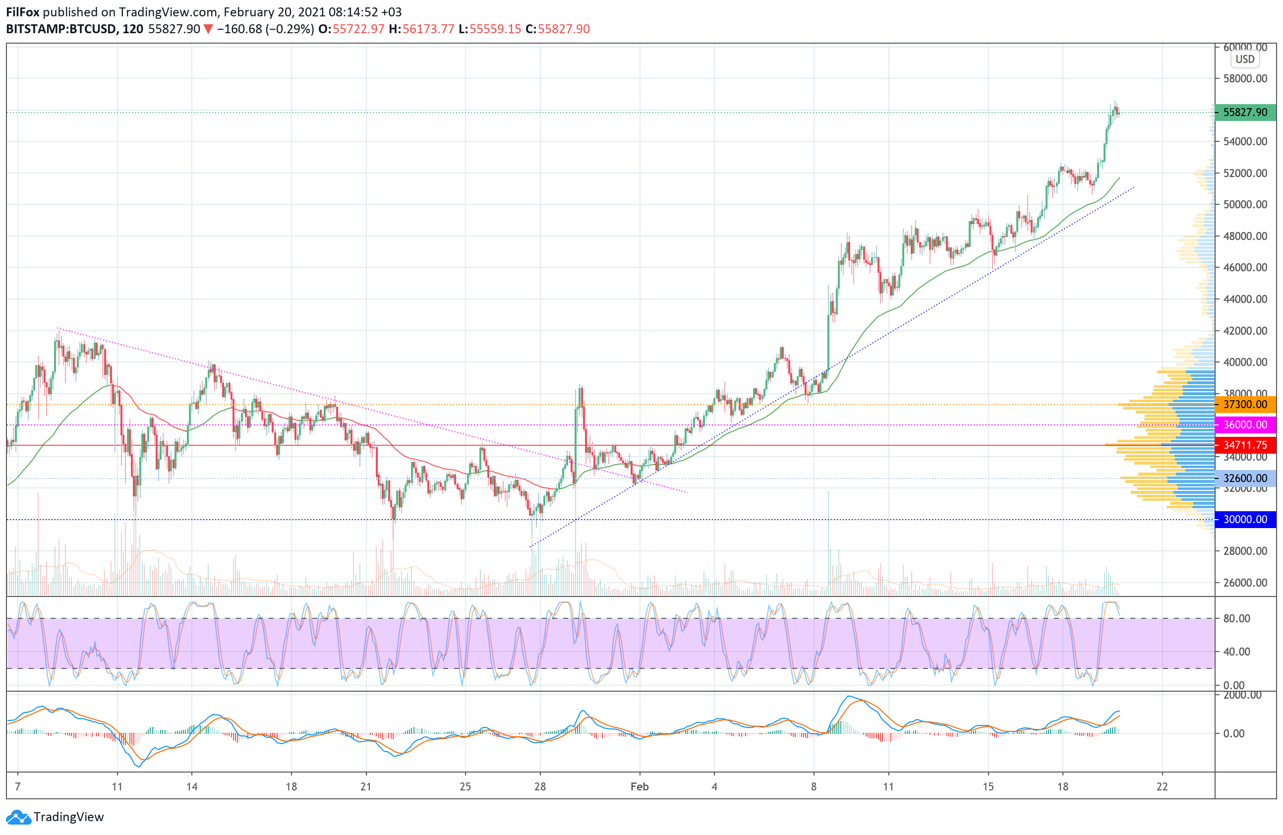 Ночью объёмы покупок продолжили снижаться, рост цены замедлился, но не остановился. На утро цена Bitcoin обновила максимум в точке 56620.00 USD.