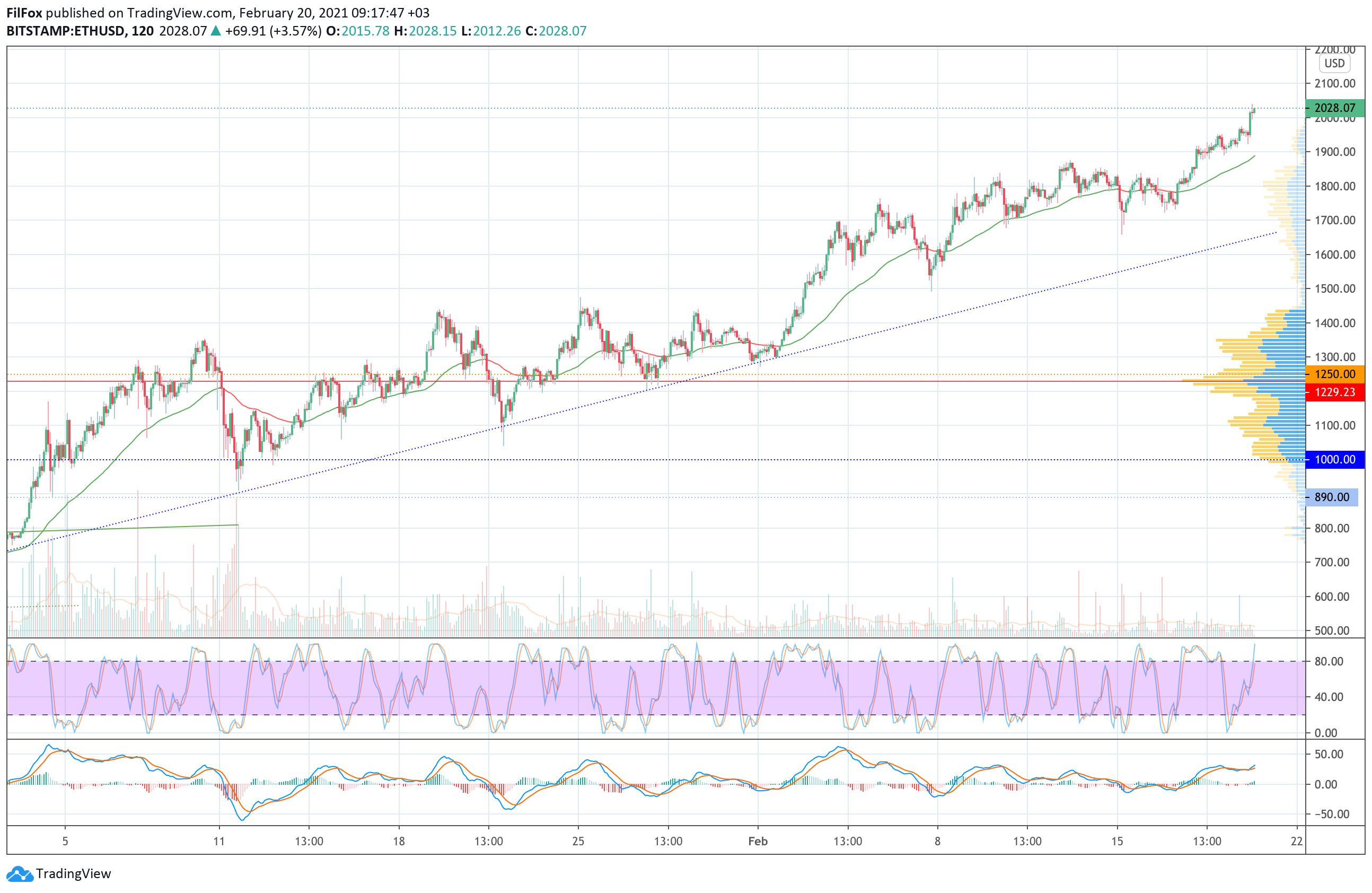 После обеда покупателям удалось сформировать мощный бычий импульс, который позволил цене эфира вплотную подобраться к целевой отметке 2000.00 USD. Дневной максимум был зафиксирован в районе отметки 1975.00 USD, а сегодня рано утром, бычий забег продолжился и цена ETH пробила психологический уровень 2000.00 USD, установив исторический максимум в точке 2040.00 USD.
