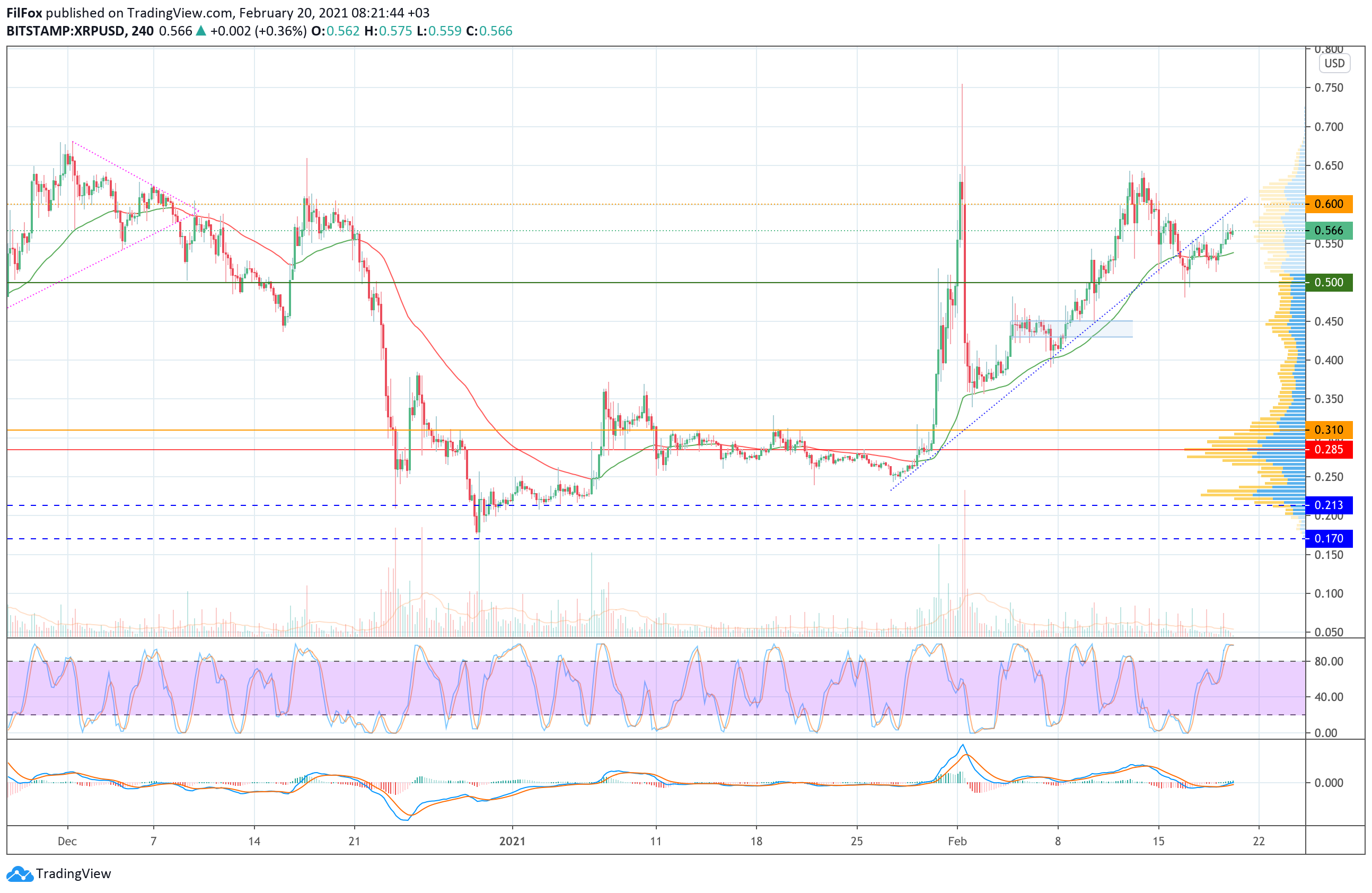 Вчера утром пара XRP/USD консолидировалась в узком боковом диапазоне. Днём покупатели предприняли очередную попытку прорвать восходящую синюю линию тренда, но до сегодняшнего дня трендовая линия по-прежнему сдерживает восстановление цены XRP в восходящий канал.