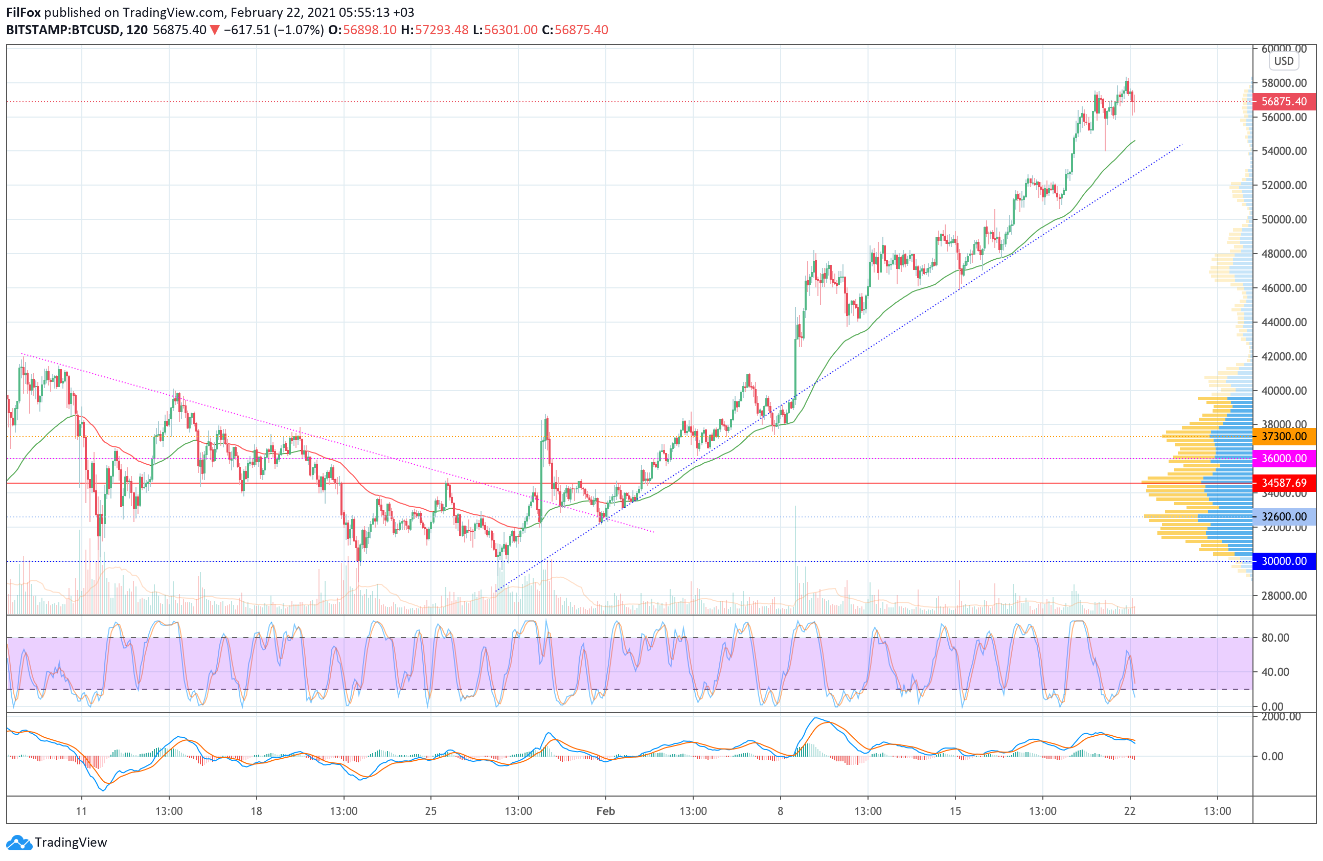 В завершении минувшей недели цена Bitcoin обновила абсолютный максимум выше отметки 58000.00 USD.