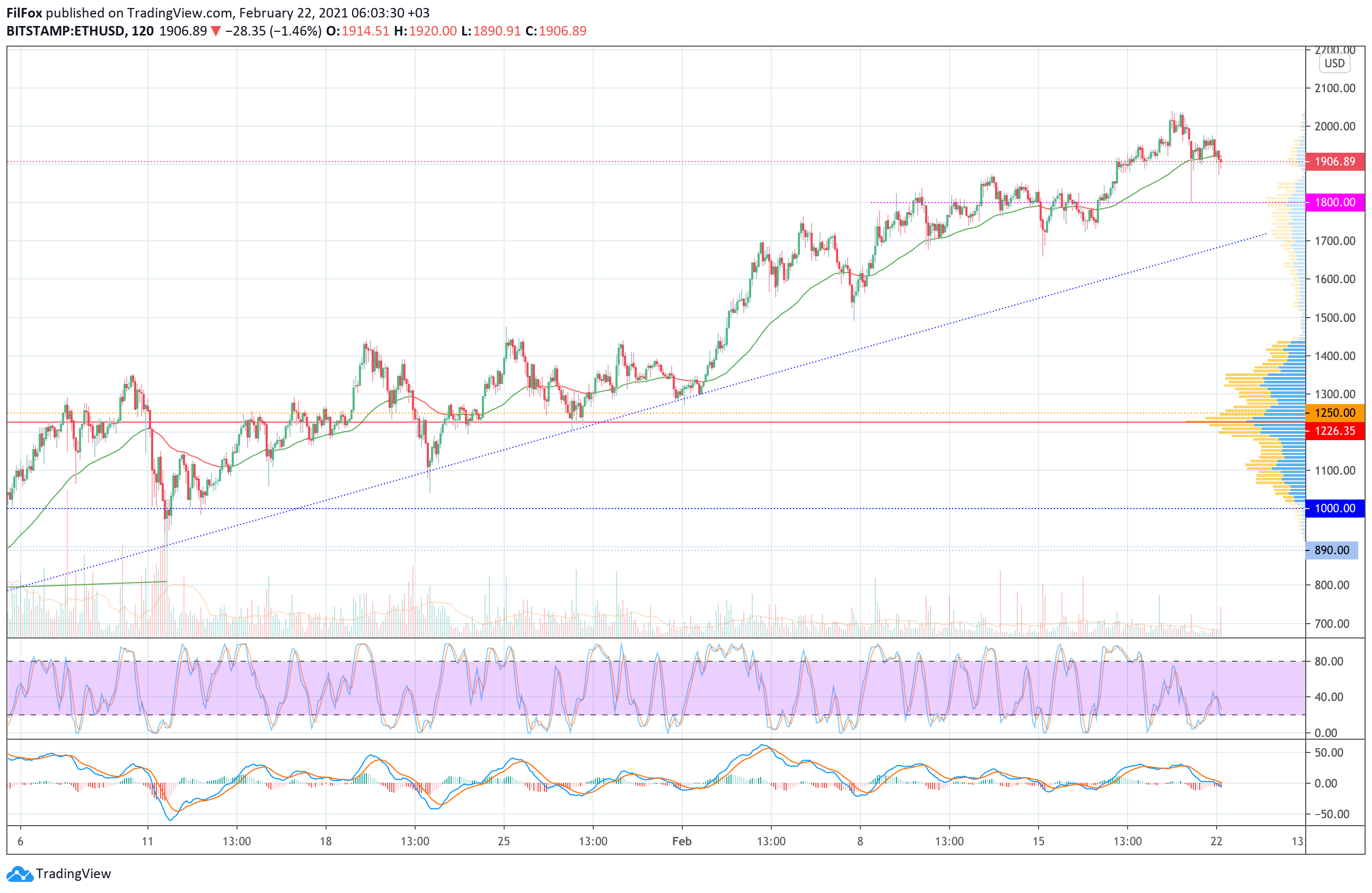 На прошедших выходных цена эфира не смогла продолжить рост. В субботу медвежий импульс протестировал поддержку 1800.00 USD, однако до конца недели пара сумела закрепиться выше уровня средних цен.