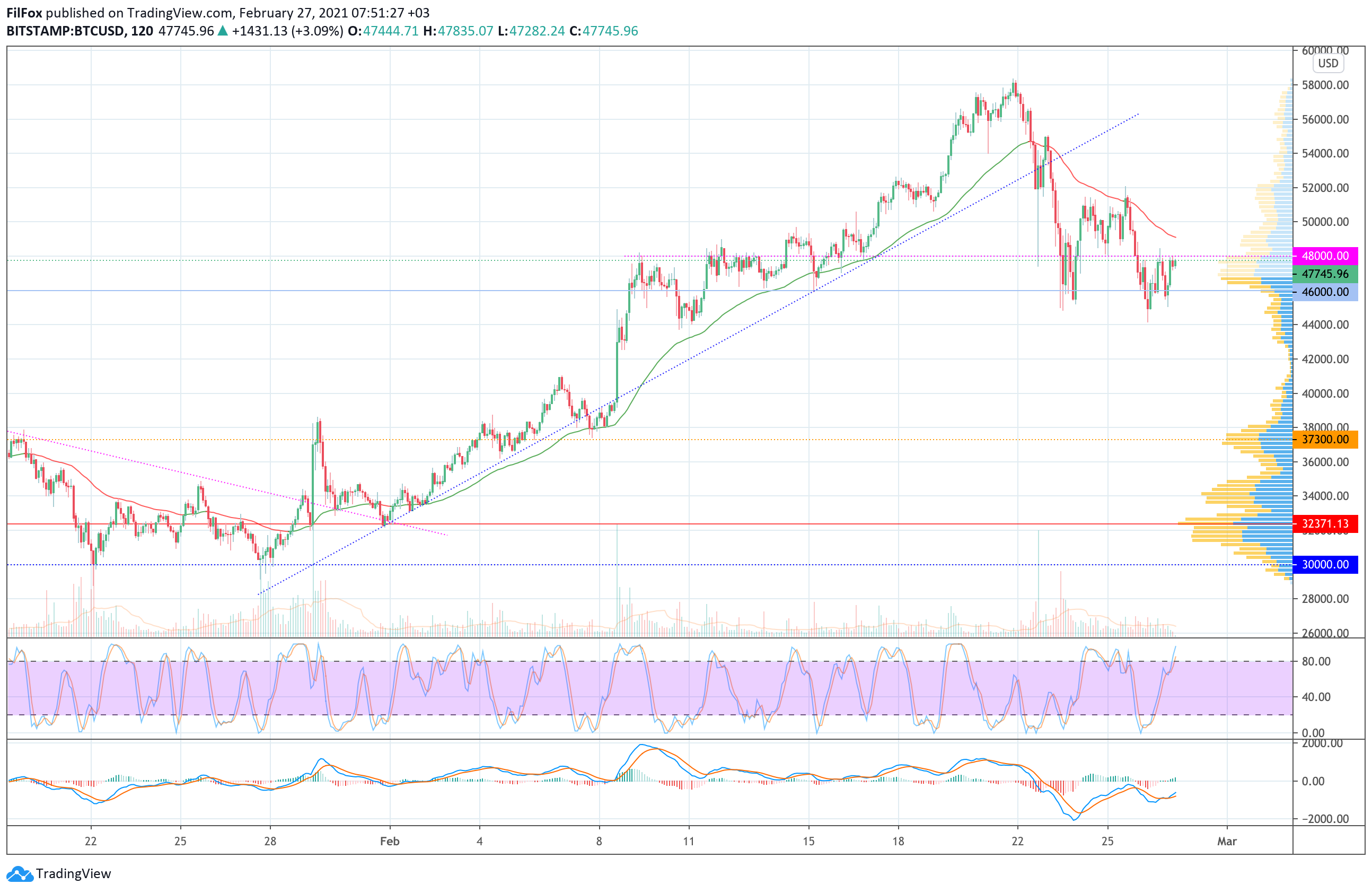Вчера цена биткоина восстановилась к сопротивлению 48000.00 USD, однако закрепиться выше этого уровня пара так и не смогла. К завершению дня продавцы вернули цену ниже поддержки 46000.00 USD, но на сегодняшнее утро, восстановившись к уровню 48000.00 USD, пара демонстрирует боковую консолидацию в достаточно широком диапазоне.