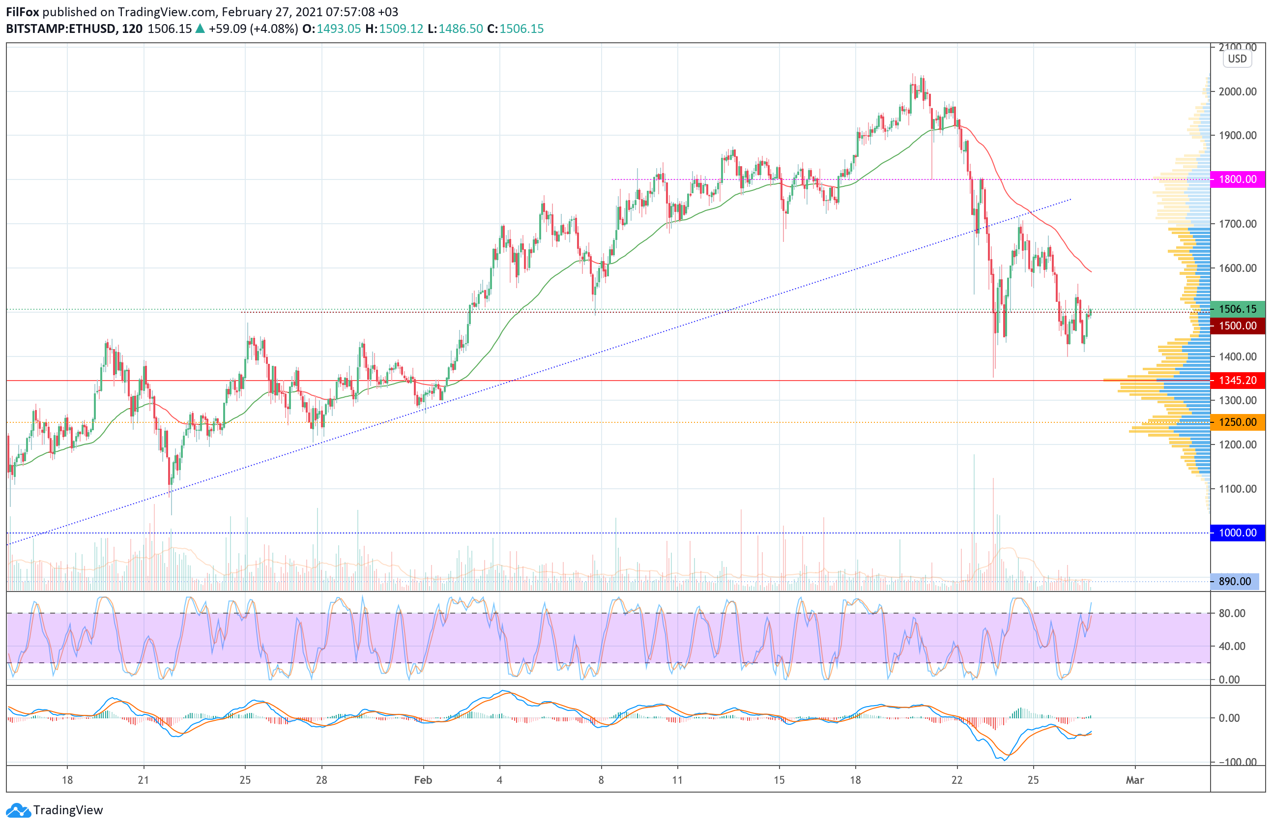 В пятницу покупатели преодолели сопротивление 1500.00 USD, но цена эфира не смогла закрепиться выше этого ключевого уровня. До завершения дня пара вернулась в зону локального минимума.