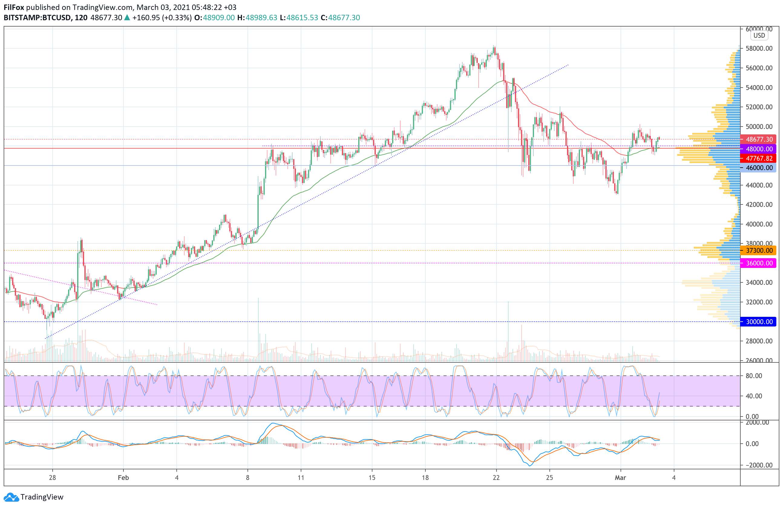Сегодня быки попытаются вытащить цену Bitcoin из бокового диапазона и протестировать уровень 50000.00 USD.