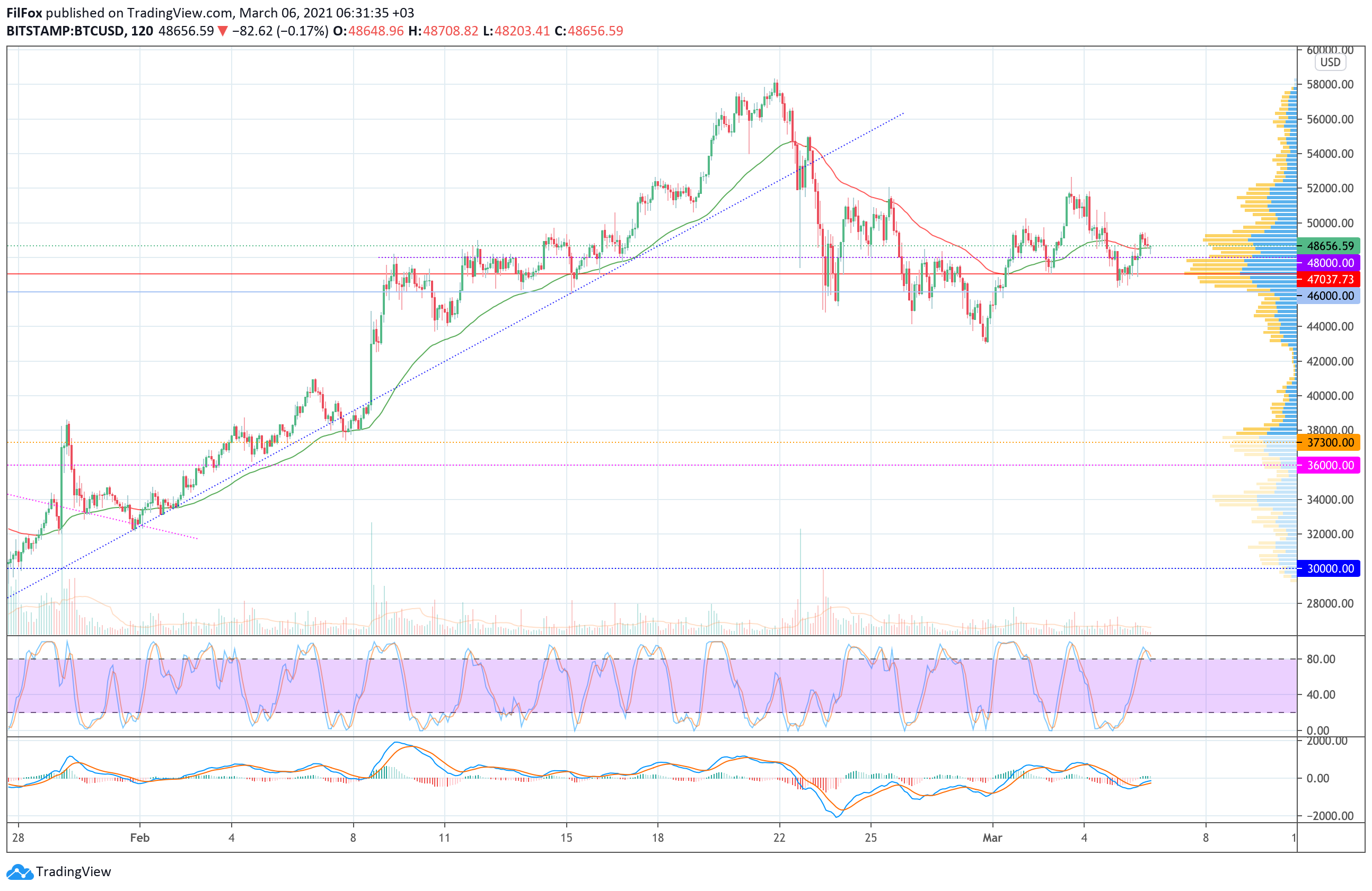 Медведи пробуют протестировать поддержку 48000.00 USD. Полагаем, что этот уровень поддержки может вернуть паре восстановительную динамику, и до завершения недели цена биткоина восстановится выше психологической отметки 50000.00 USD.