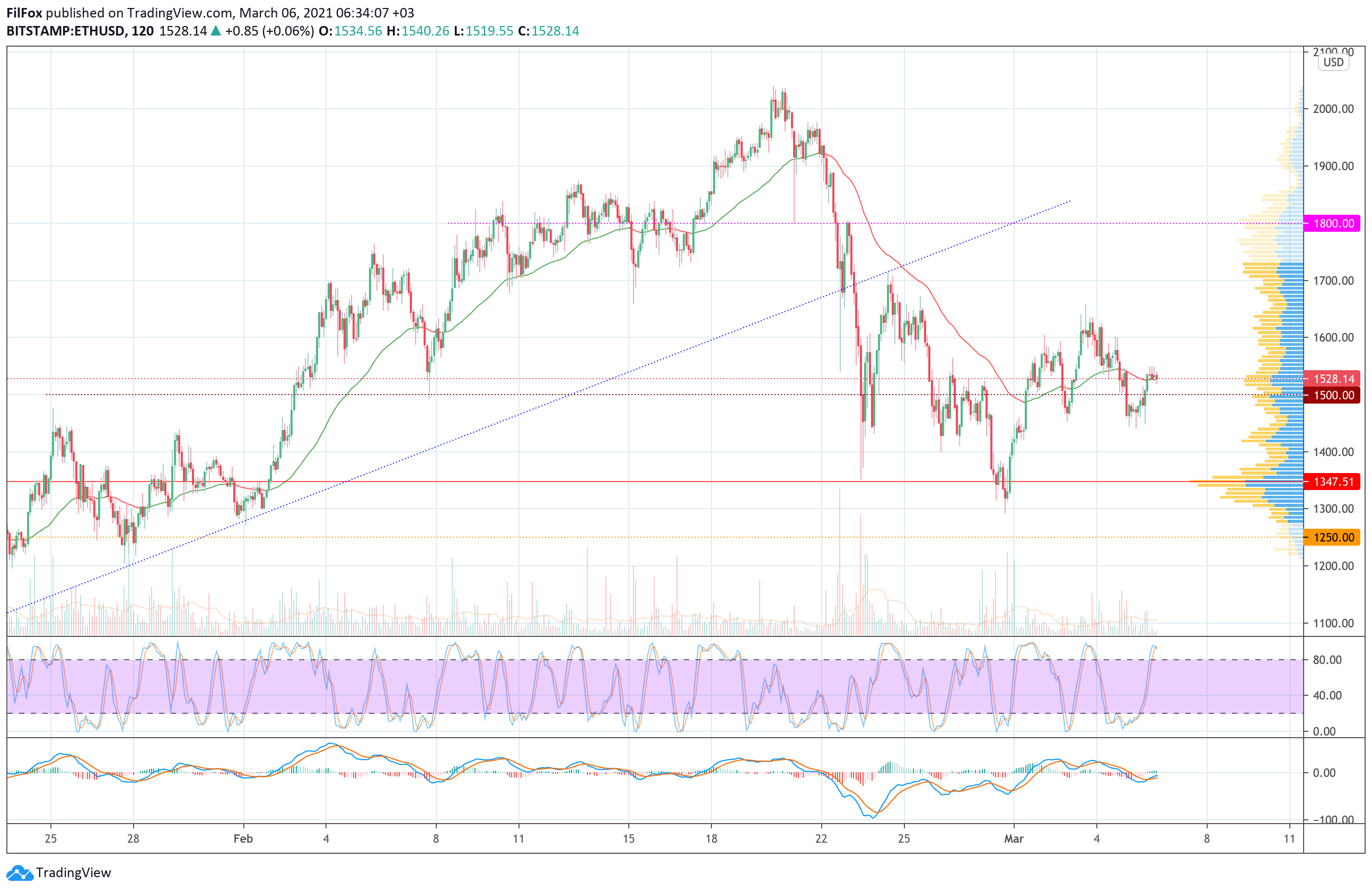 Ночью объёмы существенно сократились, и пара удерживается в консолидации выше уровня средних цен. Тем ни менее, сегодня в первой половине дня откат продолжится к уровню 1500.00 USD. От этого уровня покупатели возобновят попытки восстановить цену Ethereum, а к началу следующей недели пара может протестировать отметку 1700.00 USD.