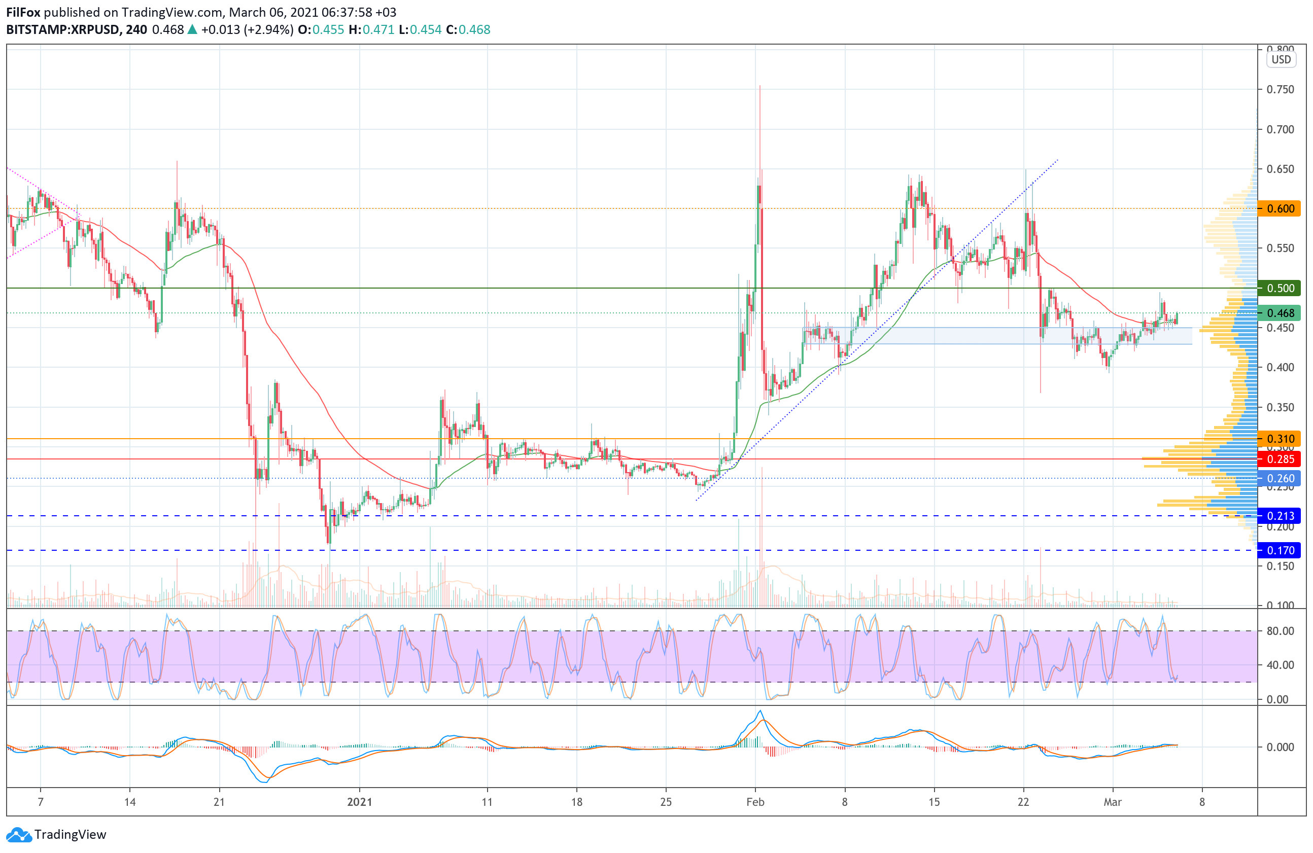 Вчера цена XRP откатилась к верхней границе бокового коридора 0.450 USD. Интерес участников рынка к торговому инструменты был настолько низким, что весь день объёмы торгов сохранялись на крайне низком уровне. В результате цена консолидировалась в узком боковом диапазоне в области четырёхчасовой EMA55.