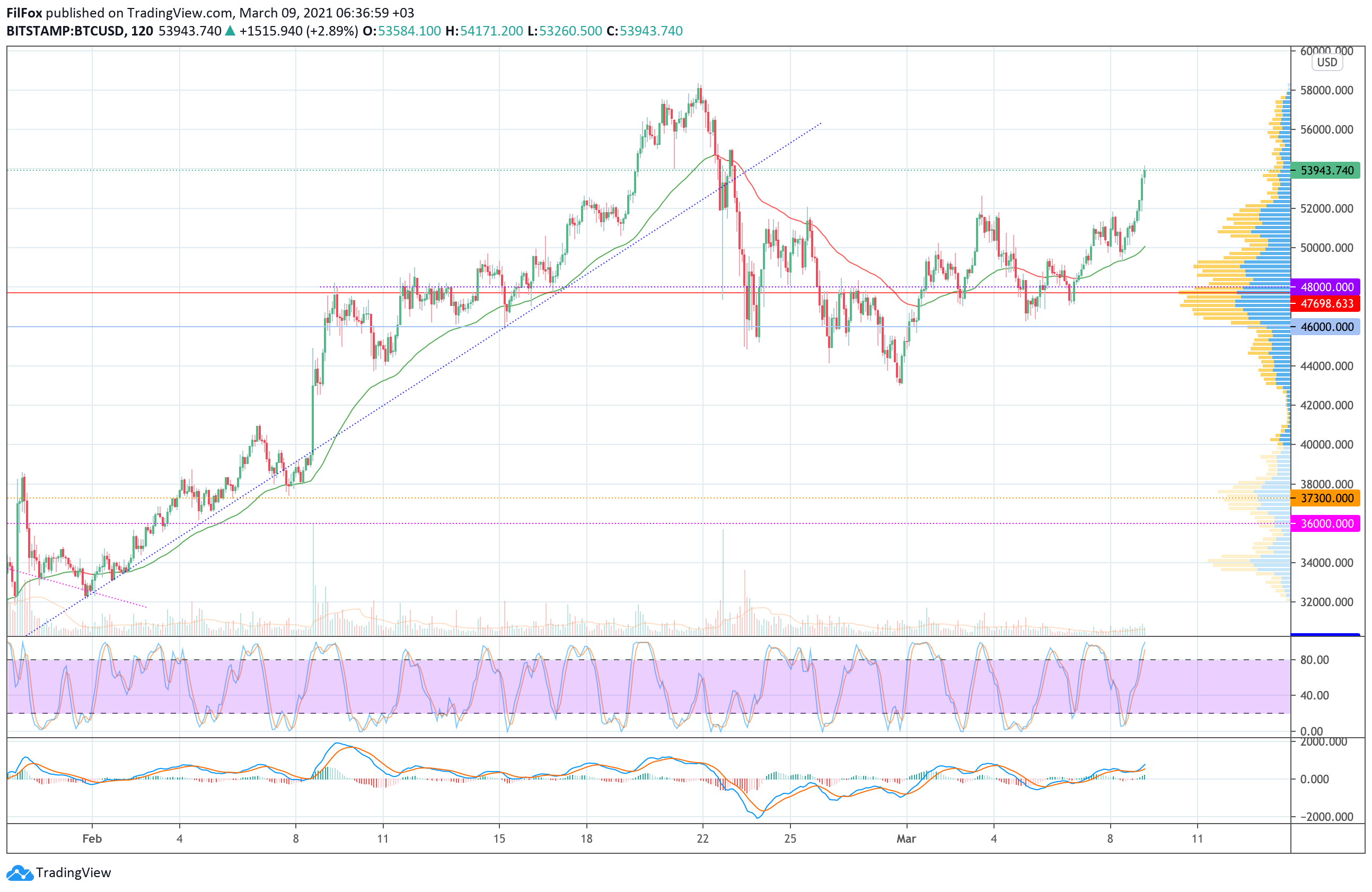 Если утром восстановление удастся продолжить, то цена протестирует уровень 55000.00 USD. В случае отката - пара вернётся к рубежу 52000.00 USD.