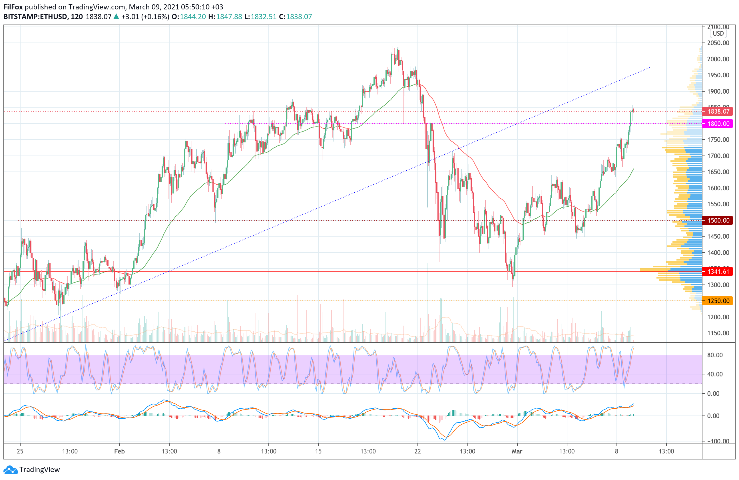 Вчера утром медведям не хватило сил закрепиться ниже отметки 1700.00 USD и цена эфира в течение дня восстановилась в область сопротивления 1800.00 USD.
