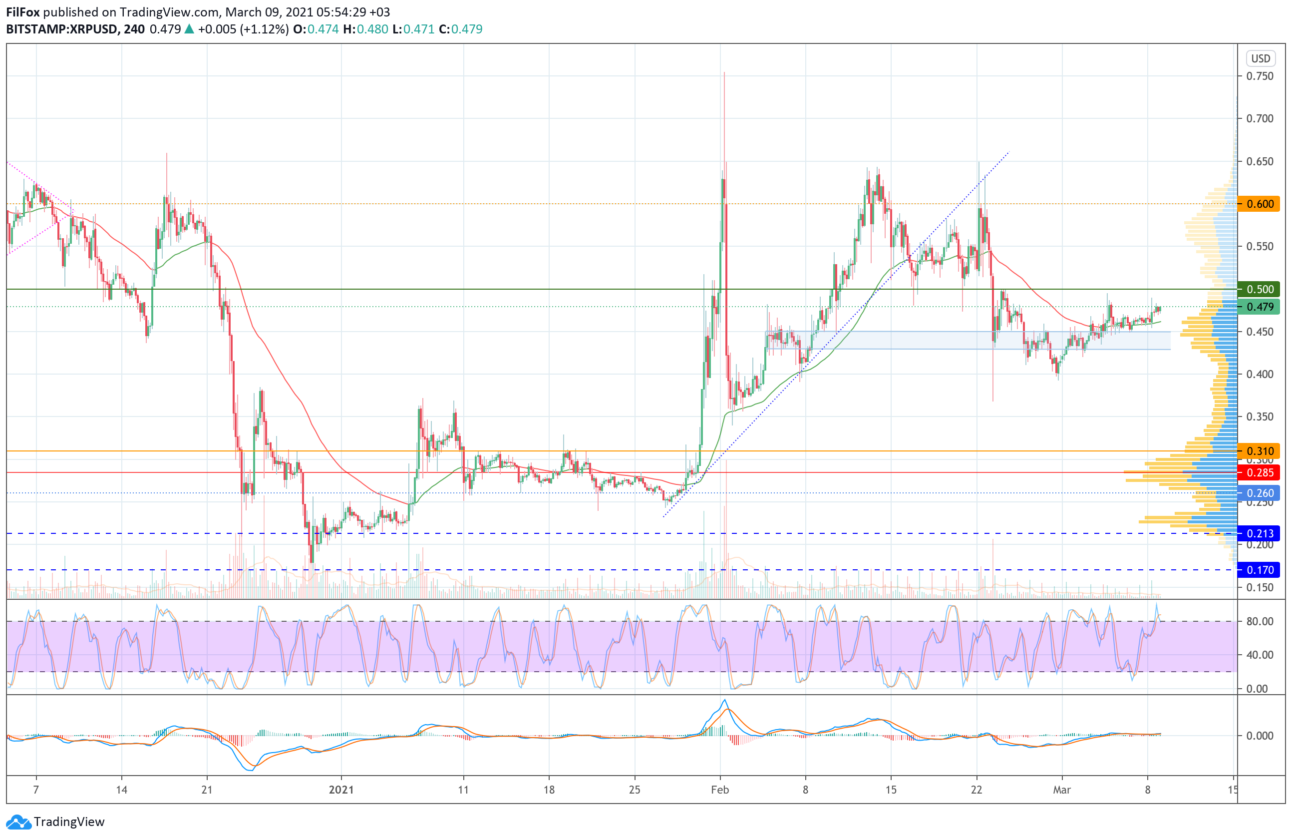 За минувшие сутки волатильность цены XRP была довольно низкая. Пара закрепилась выше четырёхчасовой EMA55 и вчера зафиксирована слабая попытка приблизится к психологическому уровню 0.500 USD. Однако, усилия покупателей ограничились локальным максимумом в точке 0.490 USD.