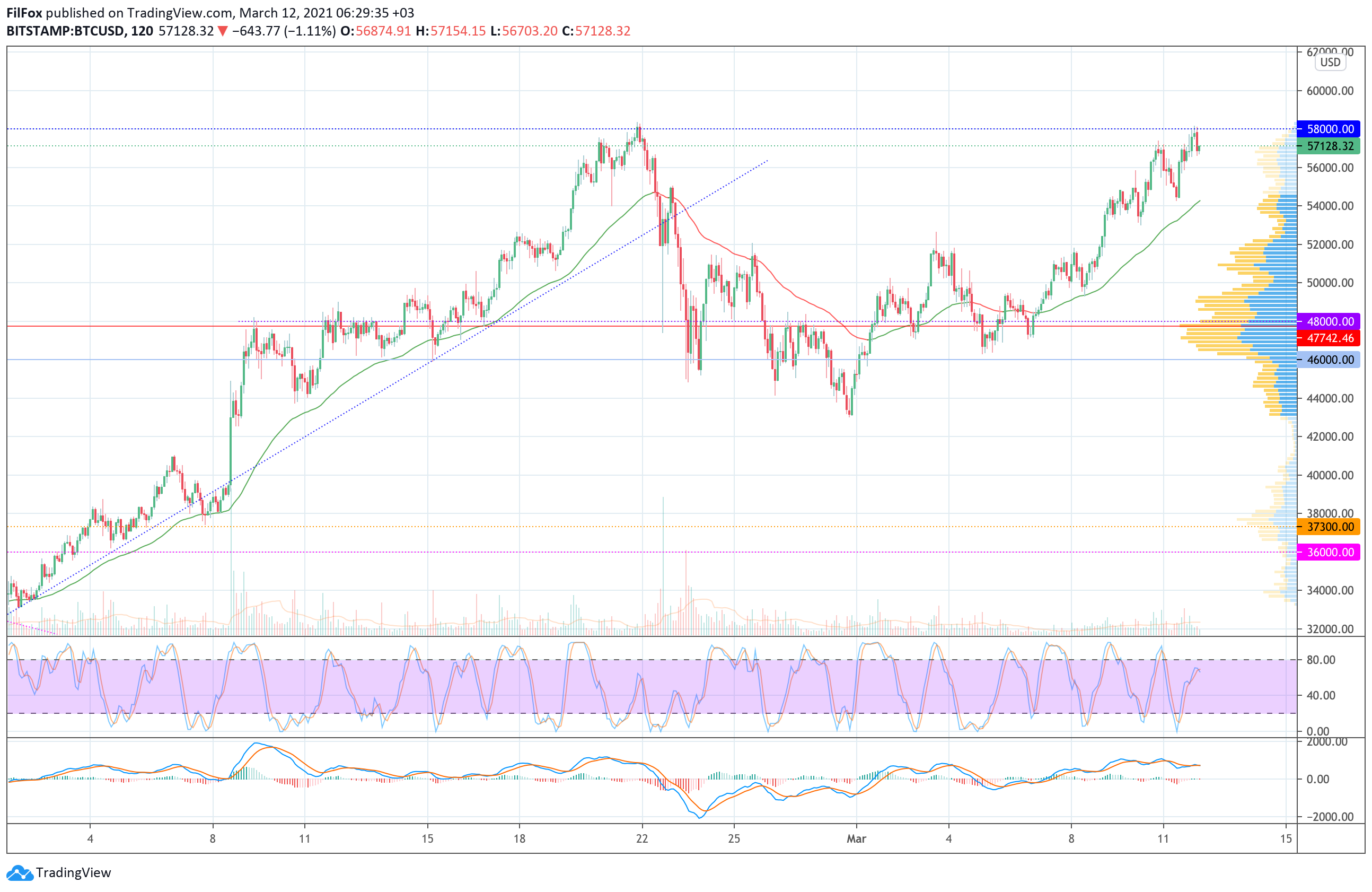 Цена Bitcoin восстановилась к сопротивлению 58000.00 USD. После небольшого отката бычий забег может продолжиться в область 60000.00 USD.