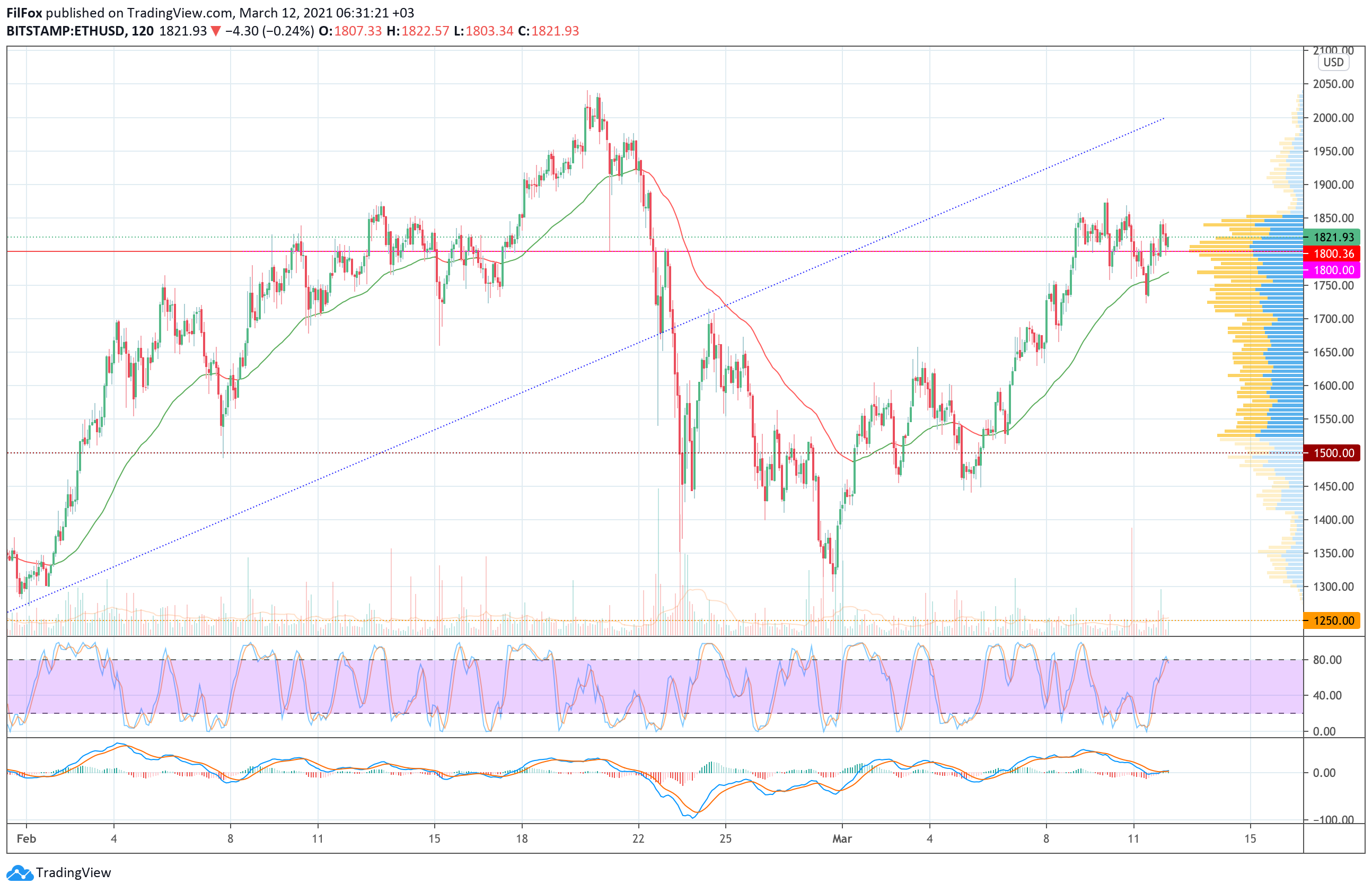 Во второй половине дня цена эфира долго пыталась справиться с сопротивлением на уровне 1800.00 USD. Только к завершению дня покупатели преодолели это сопротивление и смогли закрепиться чуть выше линии POC (1800.36 USD).