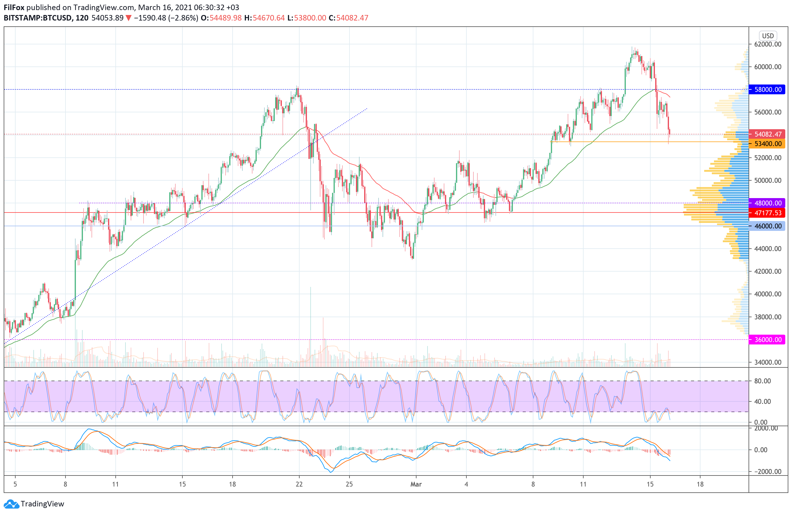 Вчера поддержка двухчасовой EMA55 на уровне 58000.00 USD не смогла остановить откат цены BTC. Медвежий импульс был настолько сильным, что пара установила дневной минимум в районе отметки 54555.00 USD.