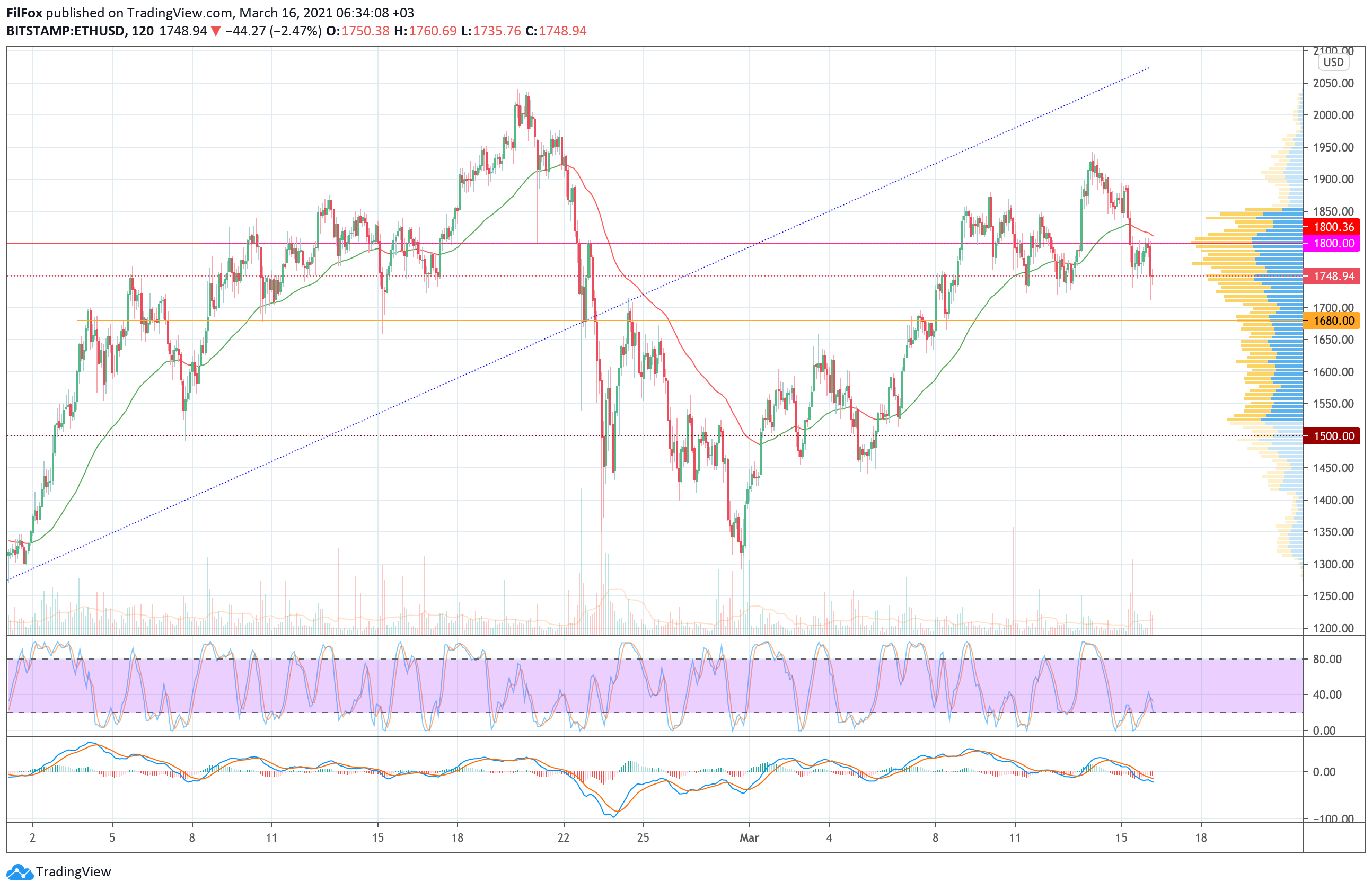 Вчера продавцы пробили довольно сильный уровень поддержки 1800.00 USD и установили локальный минимум в точке 1732.00 USD. До конца дня покупатели пытались восстановить пару в область средних цен, но уровень 1800.00 USD не позволил цене ETH протестировать двухчасовую EMA55.