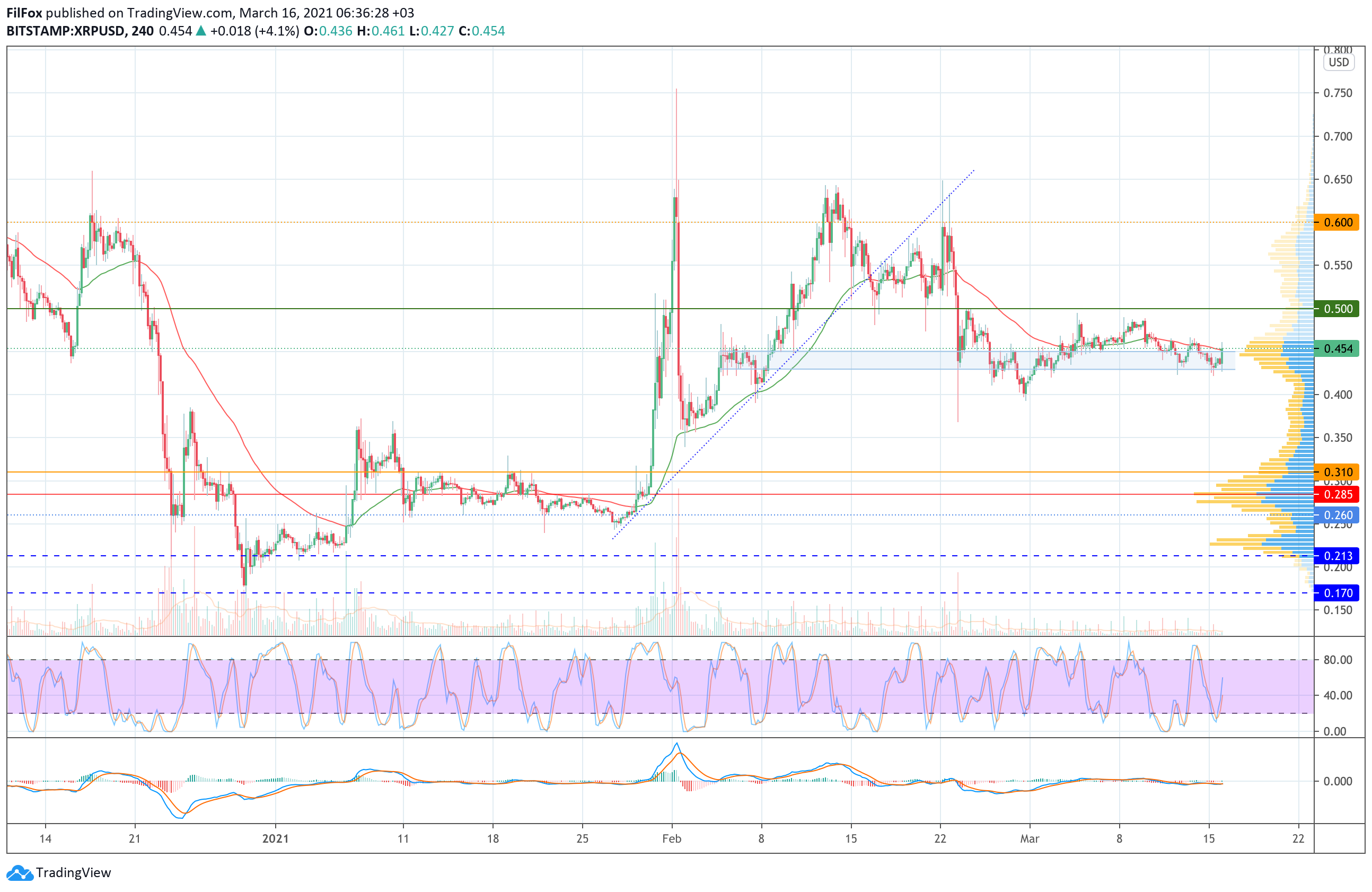 Вчера цена XRP не поддержала негативную динамику рынка. Нижняя граница бокового диапазона (0.430 USD) надёжно удерживала пару в голубом коридоре.