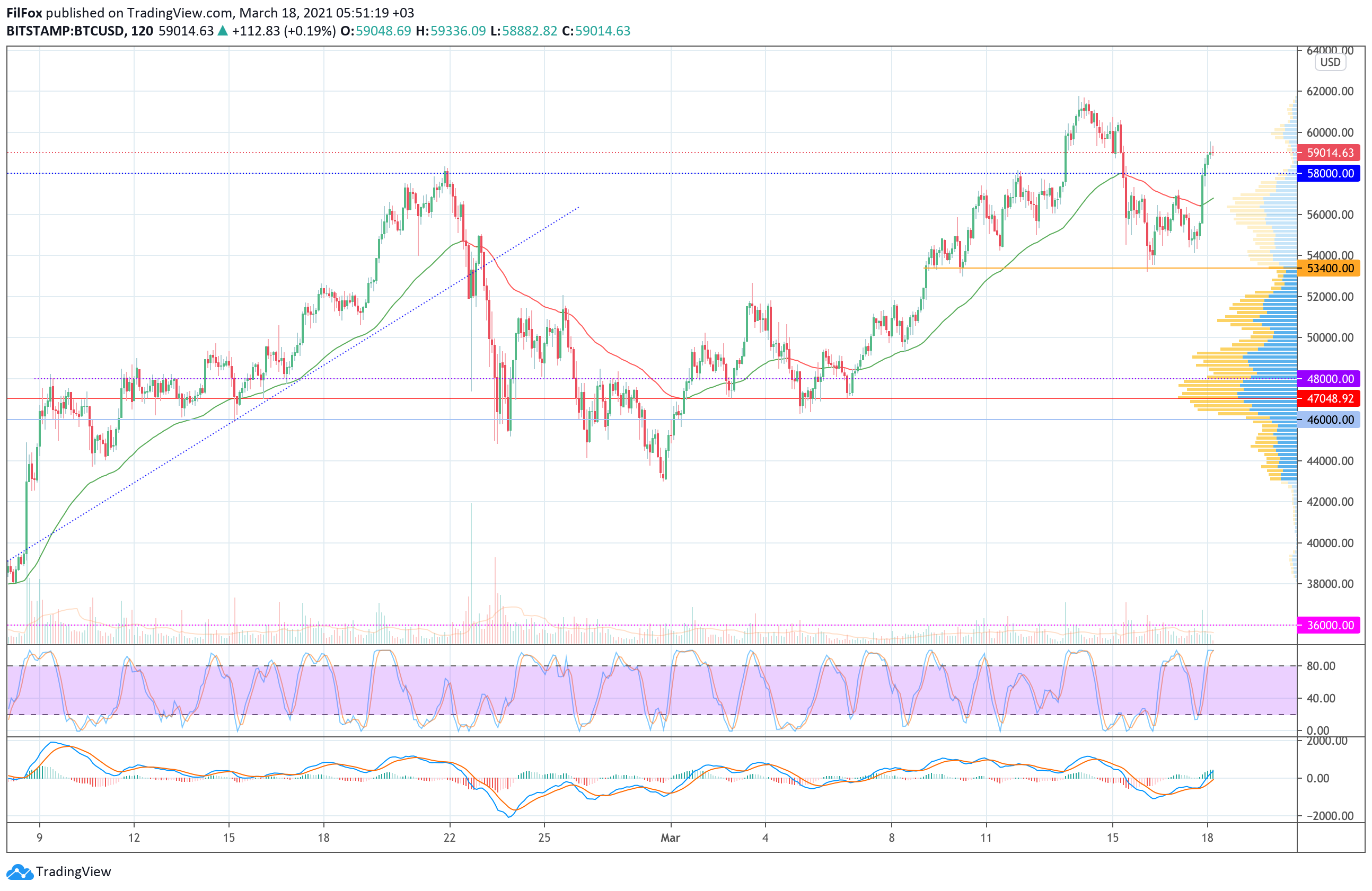 Вчера покупатели пытались восстановить пару к сопротивлению 58000.00 USD. В первой половине дня они не смогли пробиться выше 56400.00 USD, а поздно вечером быки сформировали мощный импульс, который позволил цене Bitcoin преодолеть сопротивление 58000.00 USD и закрепиться в районе отметки 59000.00 USD.