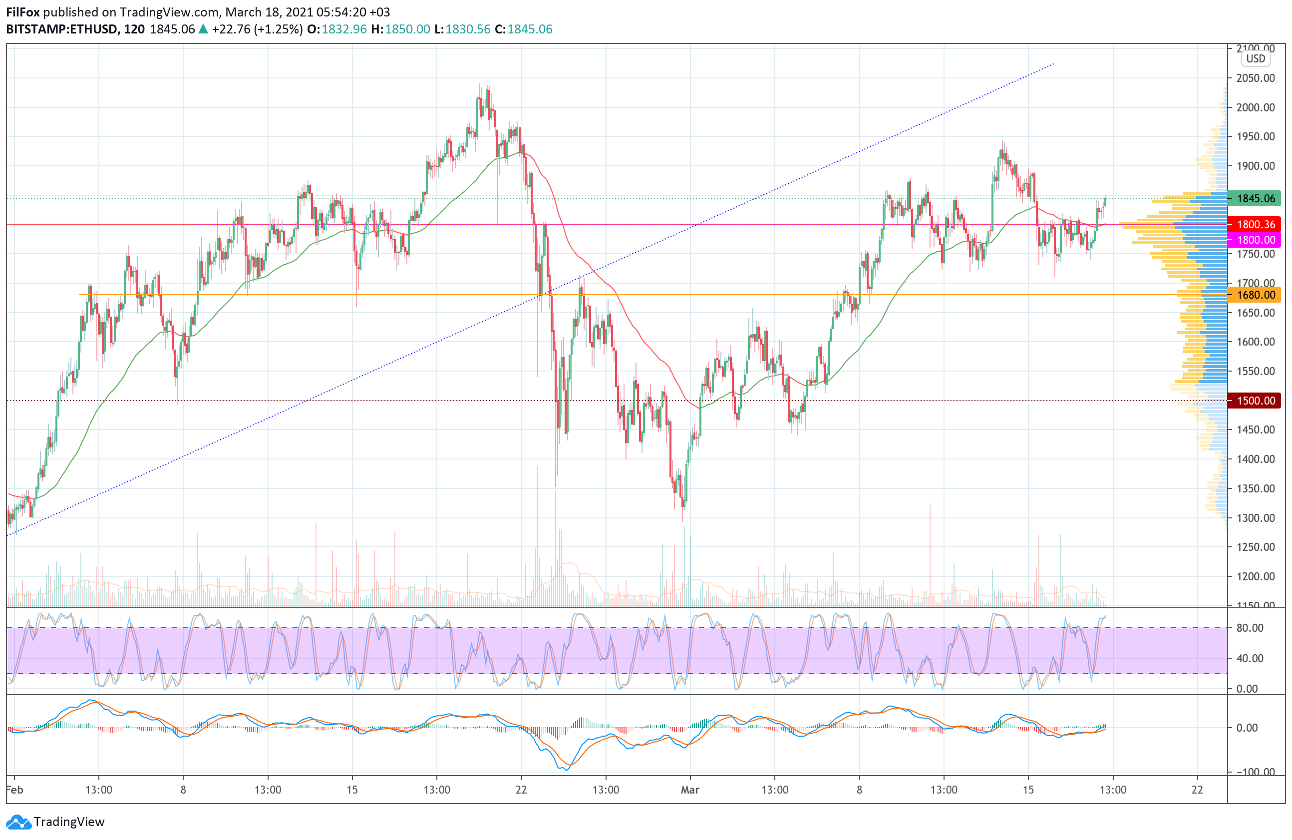 Вчера цена Ethereum долго пыталось преодолеть сопротивление 1800.00 USD. В завершении дня покупатели всё-таки пробились выше линии POC и под утро протестировали отметку 1850.00 USD.