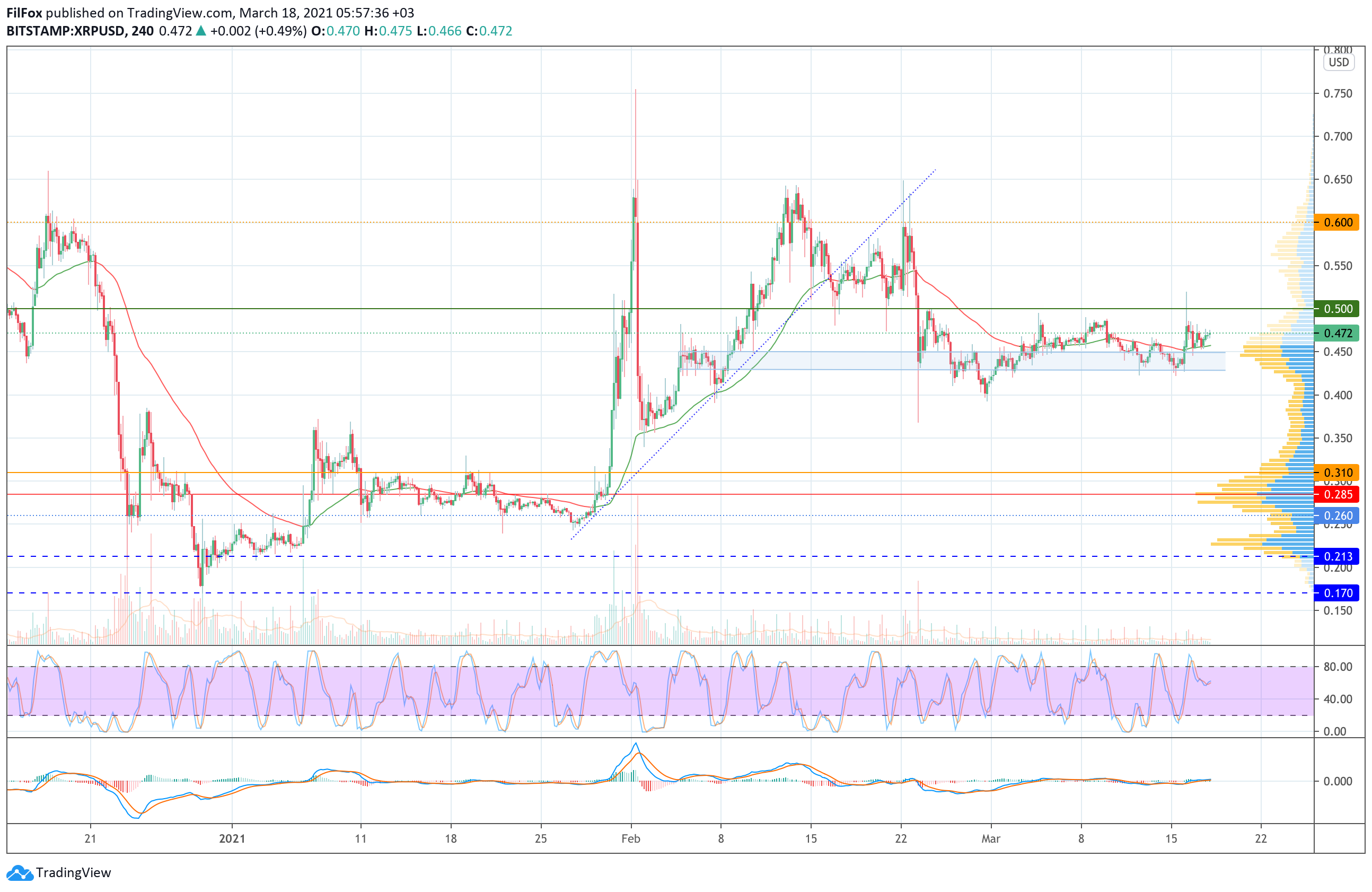 Вчера покупатели не смогли продолжить рост цены XRP к психологическому уровню 0.500 USD. Объёмы покупок были довольно мелкие, и все попытки восстановить пару увязли в районе отметки 0.475 USD, не получив дальнейшего продолжения.