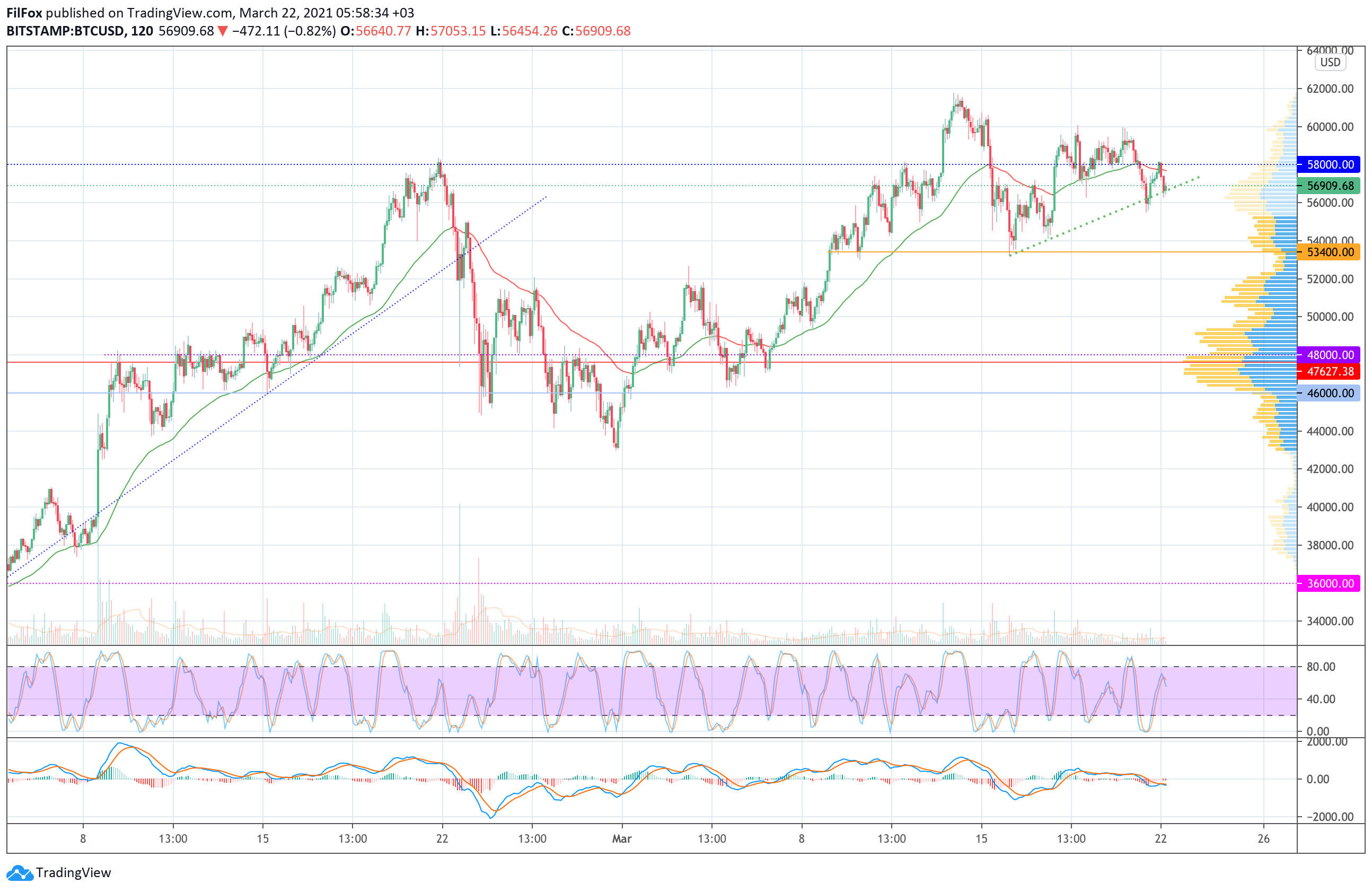 В последний день недели продавцы добились ре-теста зелёной трендовой линии. После такого отката покупателям пока не удаётся восстановить цену BTC выше уровня 58000.00 USD. Линия тренда ограничивает медвежье давление и удерживает пару в области средних цен. Если продавцы смогут сломать восходящую трендовою линию, то пара протестирует поддержку 53400.00 USD.
