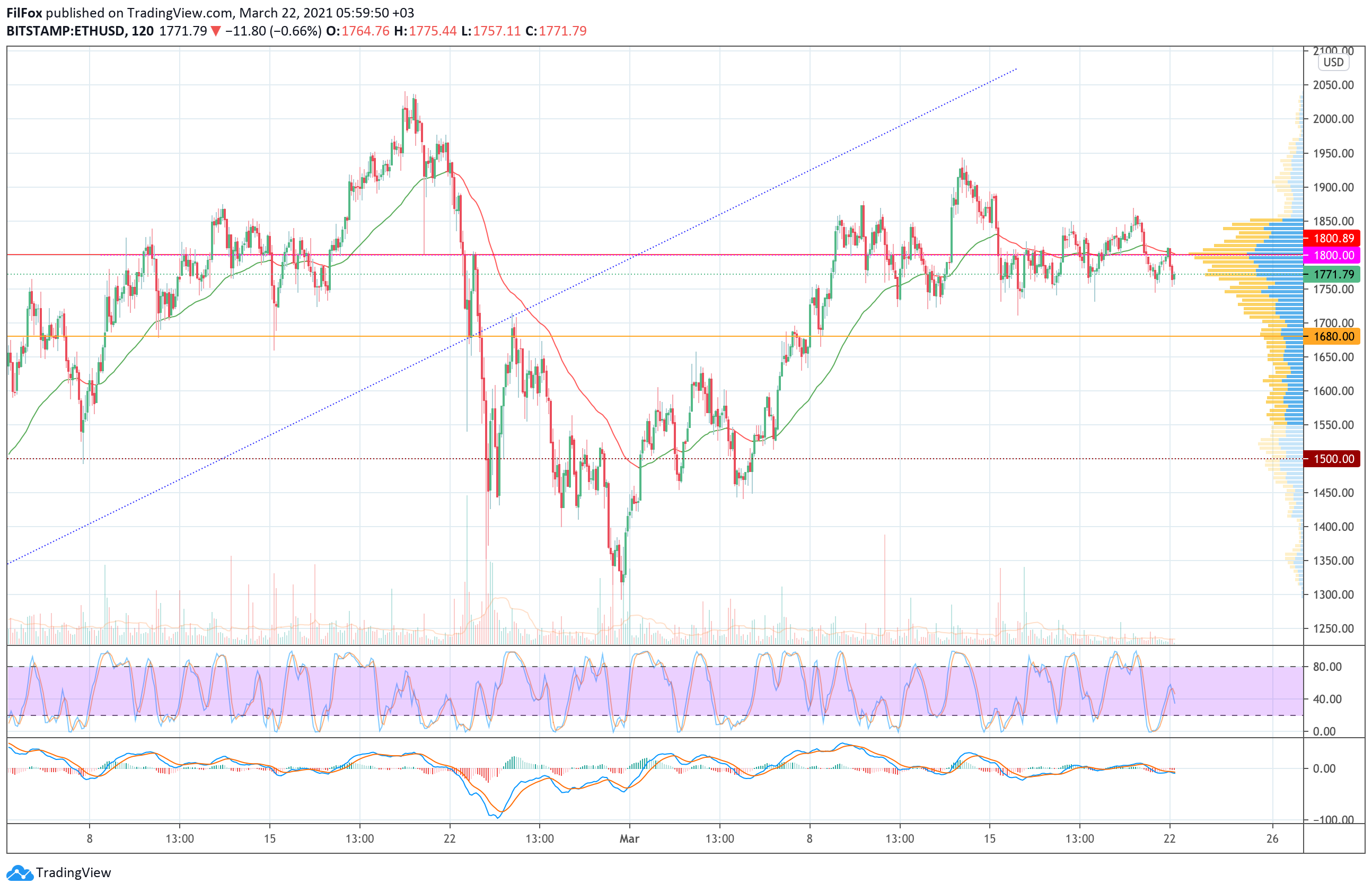 Цена Ethereum на минувших выходных не смогла пробиться выше уровня 1860.00 USD и продолжила двухнедельный марафон в боковом направлении в районе линии POC (1800.89 USD).