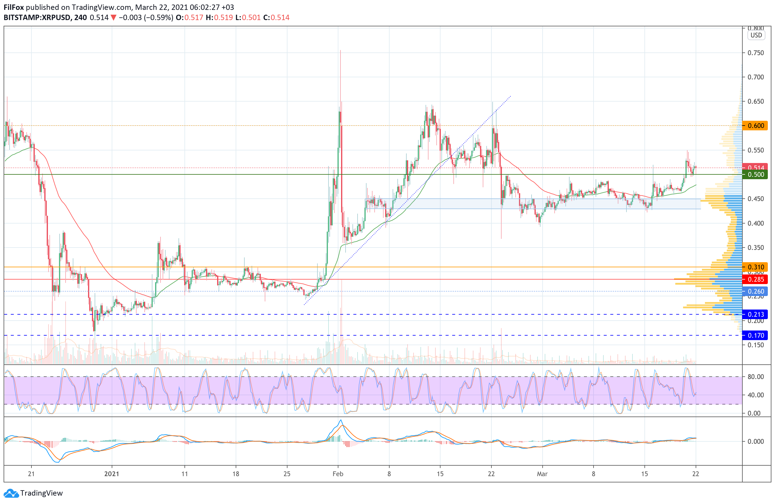 В конце прошлой недели мы скептически относились к тому, что в случает прорыва сопротивления на уровне 0.500 USD, цена XRP сможет закрепиться выше этого психологического уровня. Однако, в минувшую субботу, пара протестировала отметку 0.550 USD, и до сегодняшнего утра цена Ripple удерживается выше пятидесяти центов.
