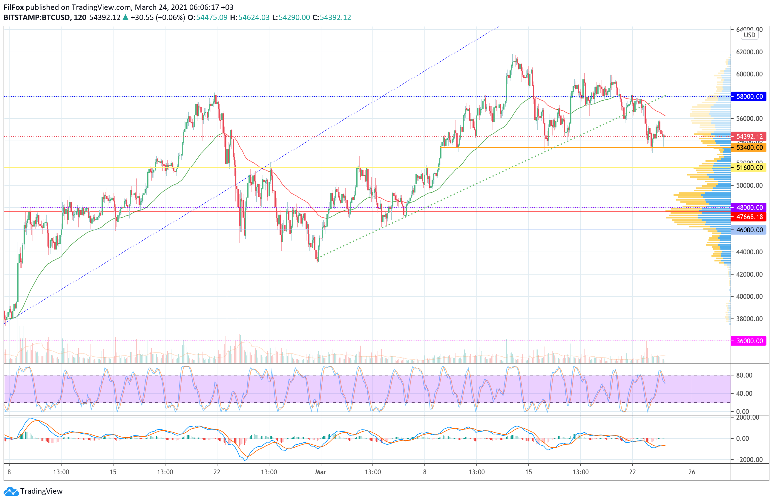 Наш вчерашний прогноз по снижению в область 51600.00 USD остаётся по-прежнему актуальным, однако если покупатели смогут прорваться выше двухчасовой EMA55, то возобновятся попытки быков вернуть пару выше зелёной восходящей линии тренда.