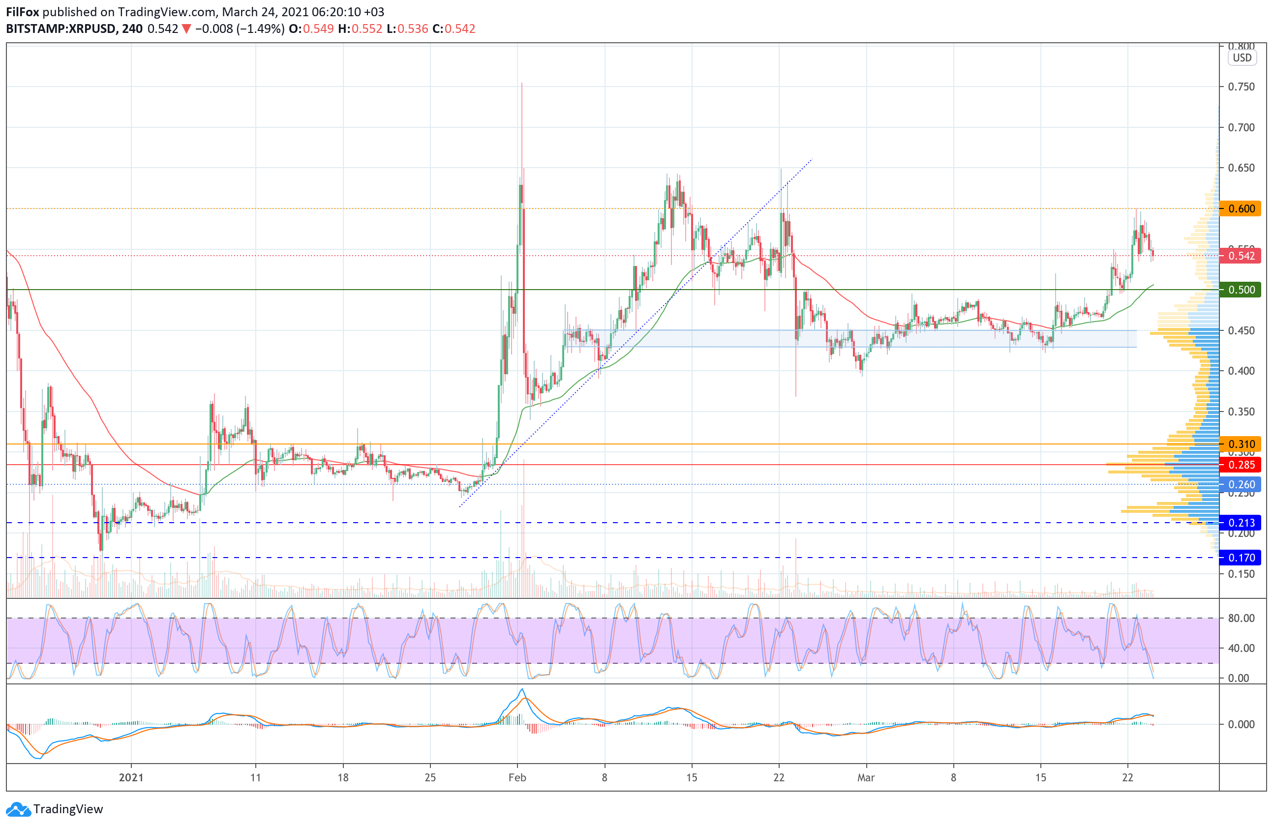 Вчера объёмы торгов по Ripple сократились ниже среднего уровня и волатильность пары уменьшилась. В завершении дня цена XRP откатилась в район отметки 0.541 USD, а сегодня ночью снижение приостановилось в точке 0.536 USD.