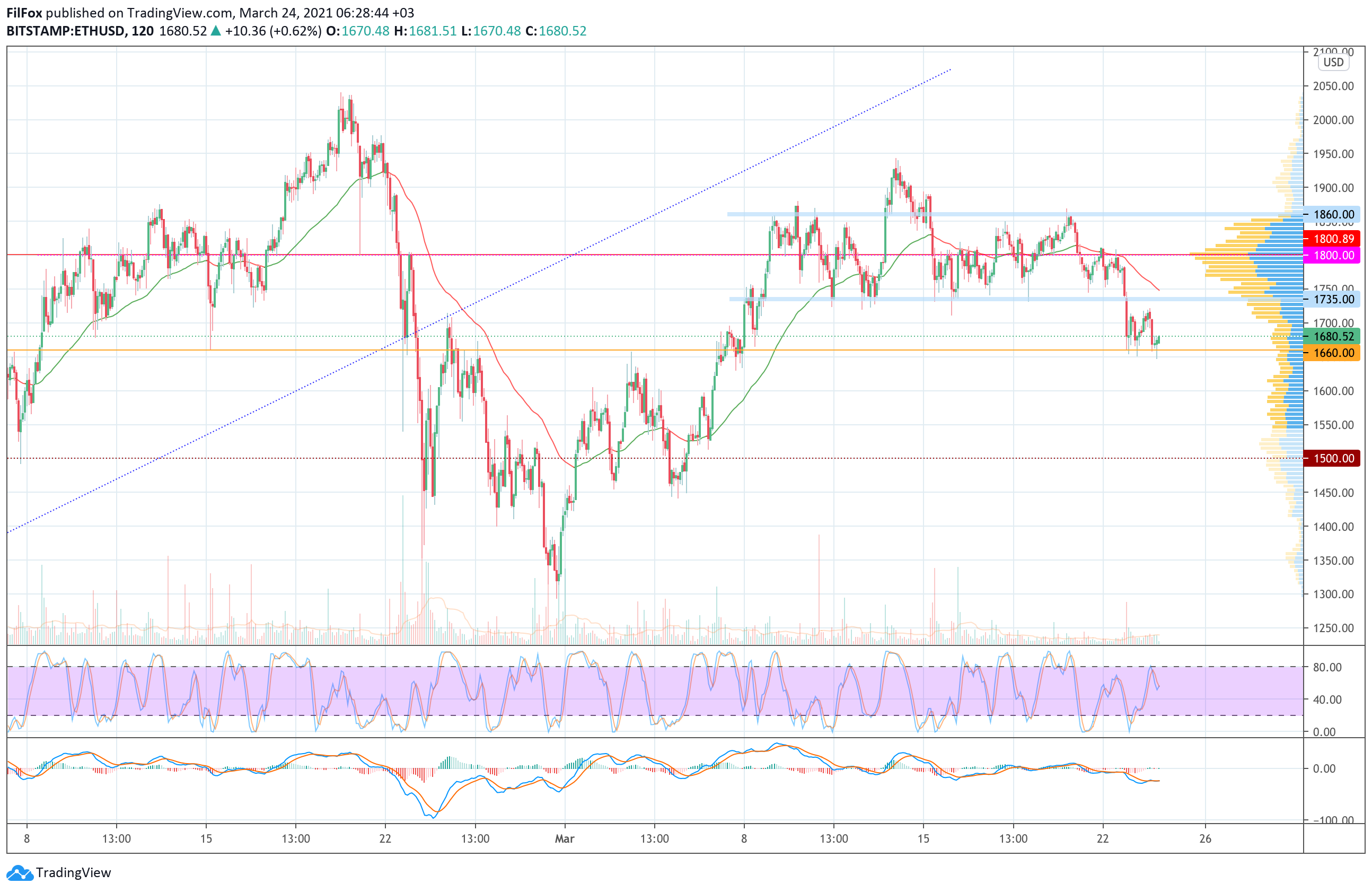 Вчера уровень 1660.00 USD сдерживал давление продавцов. Цена эфира несколько раз проколола этот уровень, но пока удерживается выше него.